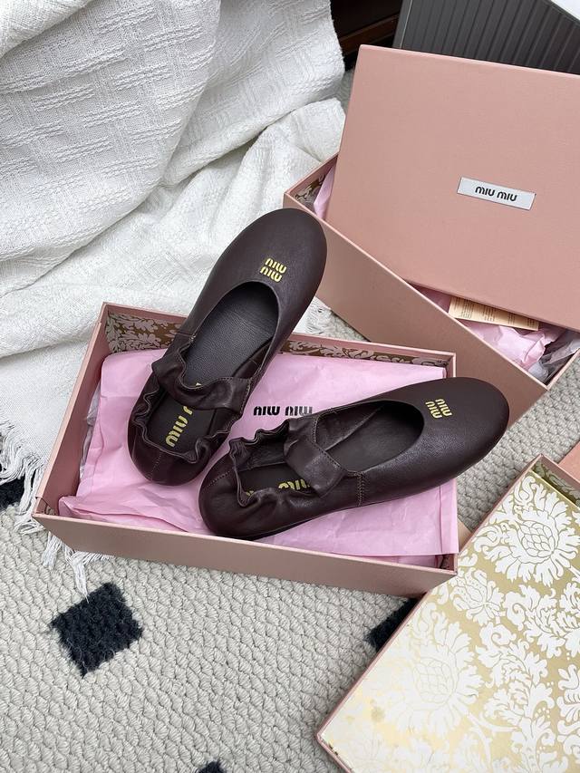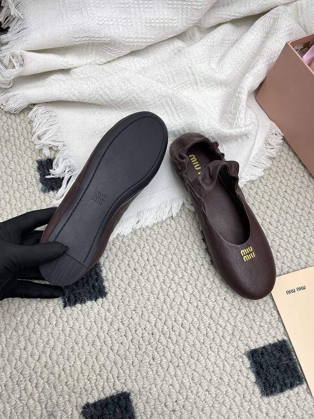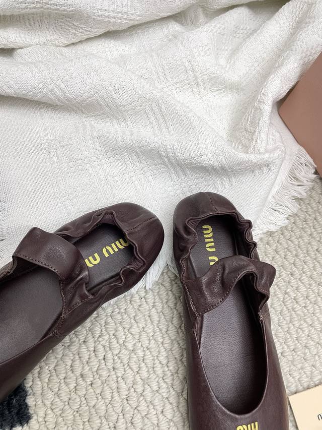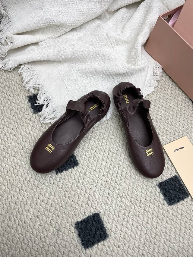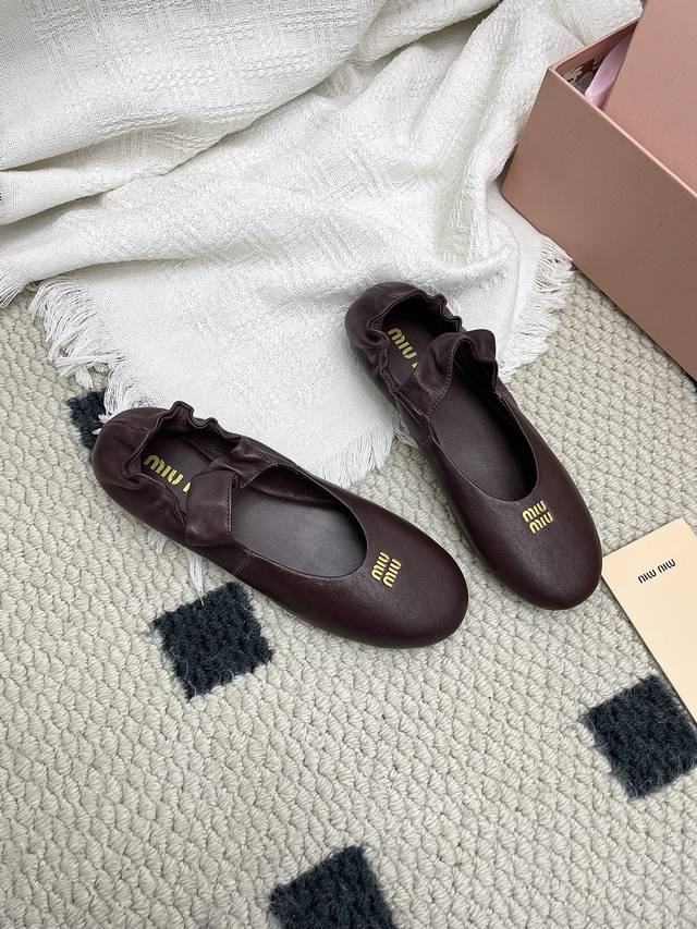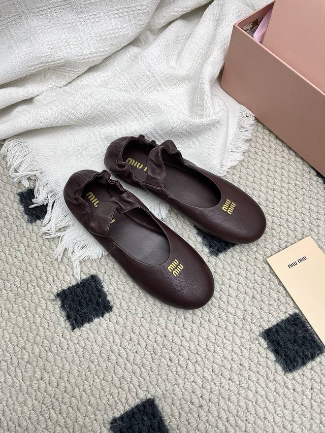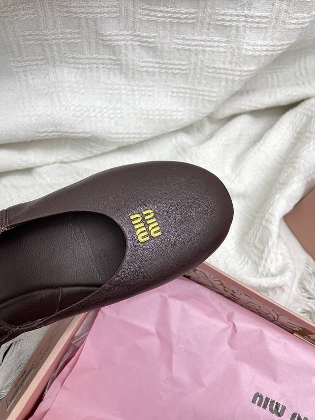 Retailer Level 2025 Spring/Summer Fashion Week Miu Miu New Elastic Ballet Flats DDD These shoes are absolutely adorable! Aside from the subtle detail of a coin sandwiched in the middle, the overall design is incredibly elegant and not bulky, with a round toe DDD Upper: Imported sheepskin DDD Lining: Imported sheepskin DDD Outsole: Original sole DDD Sizes: 35~39 Sizes 40 and 41 are custom-made, no returns or exchanges DDD
