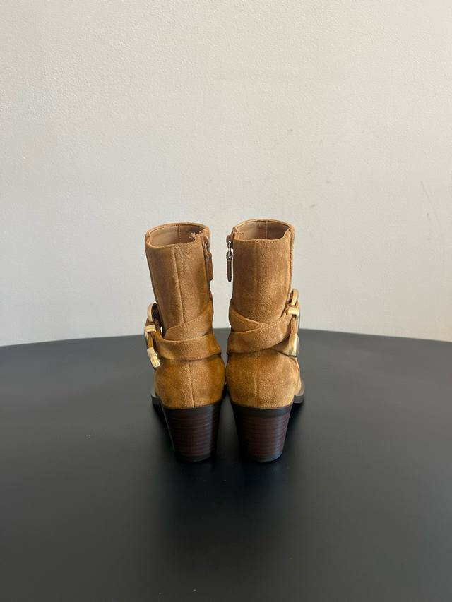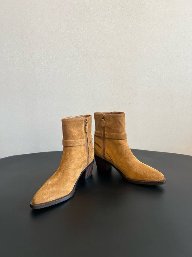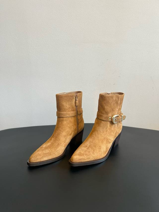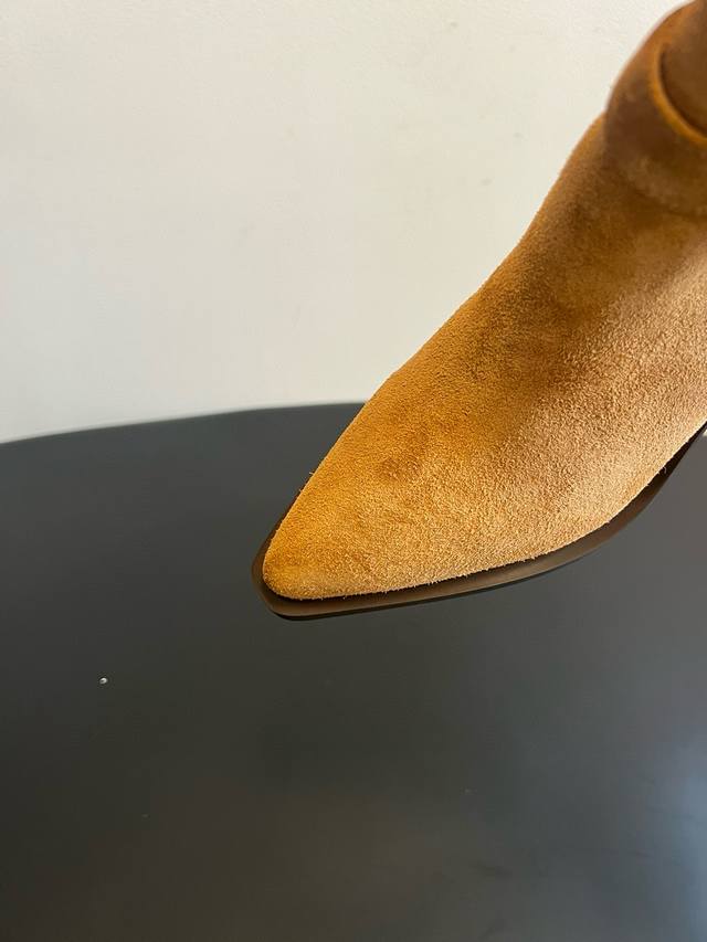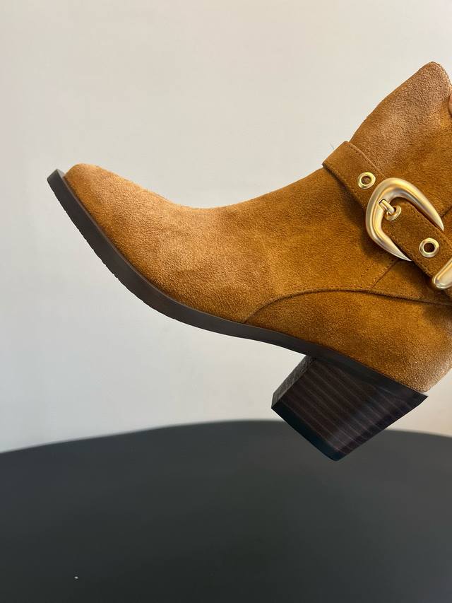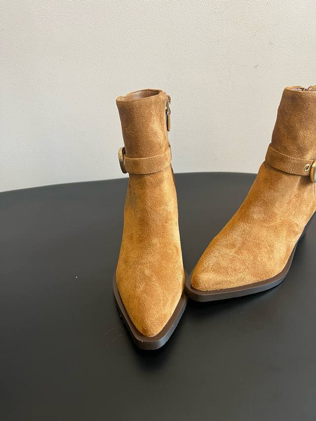Retro Modern Pointed-Toe Ankle Boots (Size Duplicate, Imported) Crafted from finely textured camel suede, these boots are soft to the touch and exude a vintage charm. The metal buckle design is a striking detail, adding both decorative appeal and enhancing the boot's three-dimensional look. A side zipper makes them easy to put on and take off, showcasing the quality of the craftsmanship. The pointed toe design paired with a chunky heel flatters the foot shape while adding a sophisticated touch, and the chunky heel ensures comfortable walking. The overall boot shape is simple and clean, with the retro feel of the camel suede contrasting beautifully with the refined metal buckle, creating a versatile and memorable style. Upper: Cowhide Suede Lining: Sheepskin Outsole: Ip Foam Outsole Sizes: 35, 40 Sizes 40 and 40 are custom-made, no returns or exchanges.