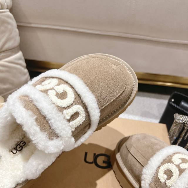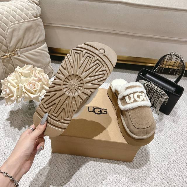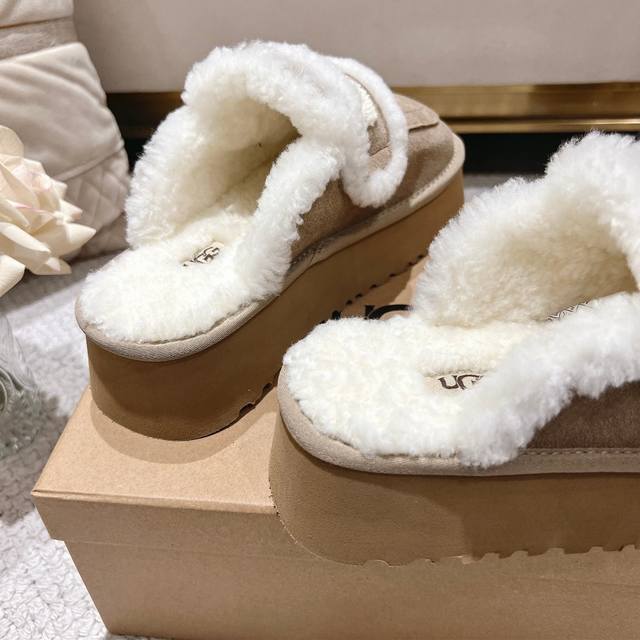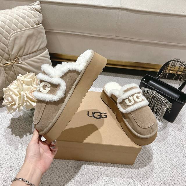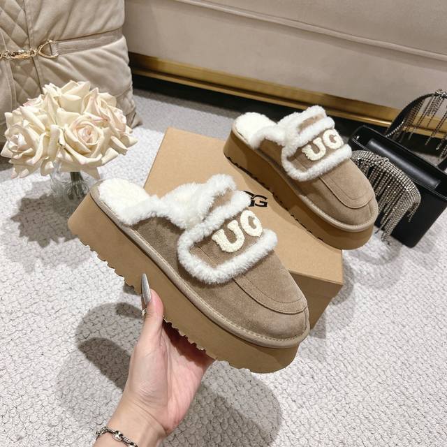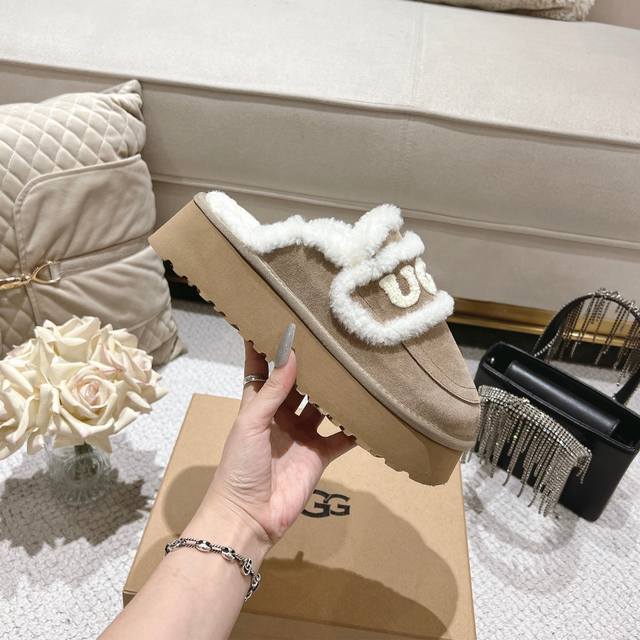 Sand-colored platform Ugg Logo sandals are so popular! These chunky, round-toed sandals with a wool trim and logo are irresistibly cute. They're so lightweight you could practically jump while walking! Available in four colors: chestnut, coffee, sand, and champagne brown. Size: 35-40