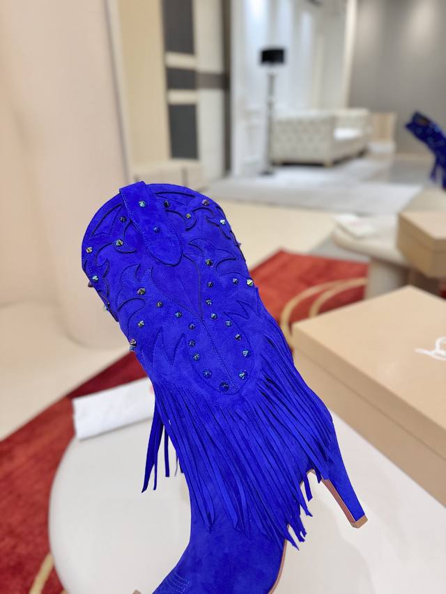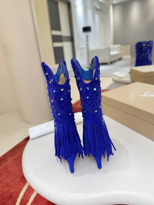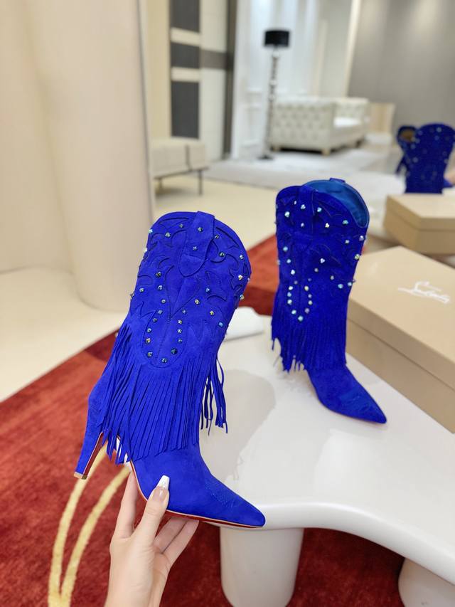 Santia Fringe boots draw inspiration from cowboy boots, redesigning the playful fusion of spikes and leather cuts, culminating in a waterfall-like fringe that covers the ankle. These boots feature a long pointed toe and an 85mm stiletto heel. They are crafted from red lambskin leather. The entire DDD high boot collection features challenging 3D embroidery on the upper, hand-stitched details, and a three-dimensional upper