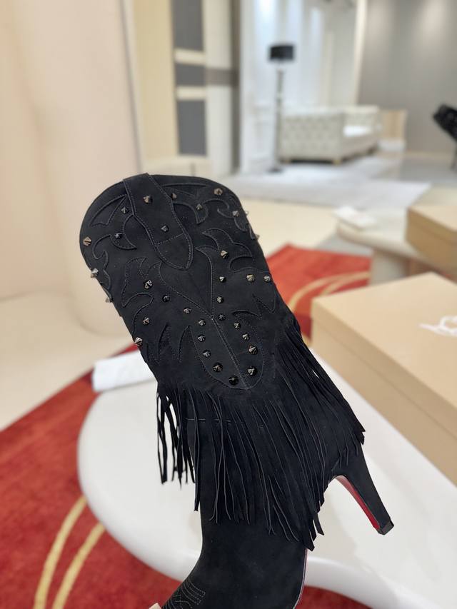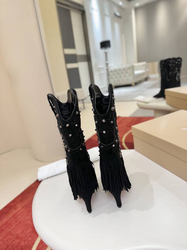 Santia Fringe boots draw inspiration from cowboy boots, redesigning the playful fusion of spikes and leather cuts, culminating in a waterfall-like fringe that covers the ankle. These boots feature a long pointed toe and an 85mm stiletto heel. They are crafted from red lambskin leather. The entire
