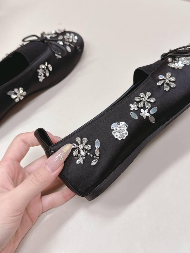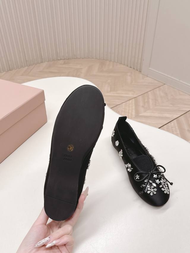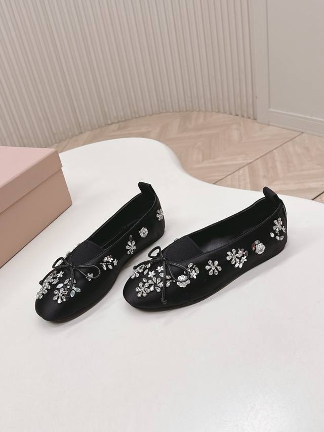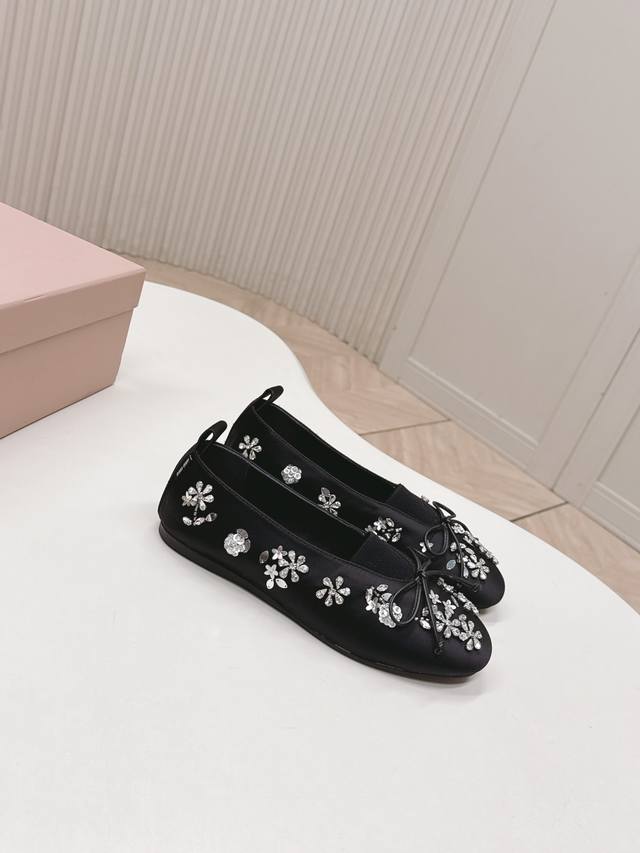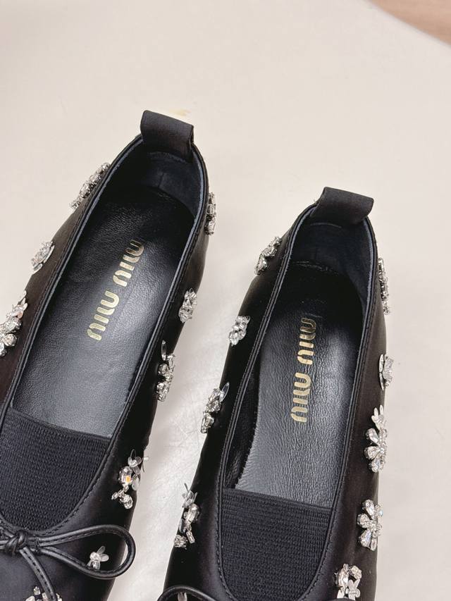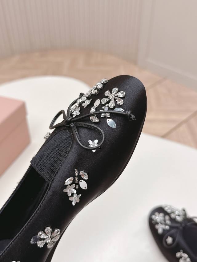 Selling Miu Miu 2026 Spring New Arrival Mary Jane Shoes. Versatile last for slim feet. Three-dimensional and full shape, comfortable and stylish. Original satin upper with rhinestone flower design, high-end and elegant style, perfect details and trendy look. Upper: High-gloss satin upper; lining: sheepskin; insole; rubber outsole. Size: 35-40