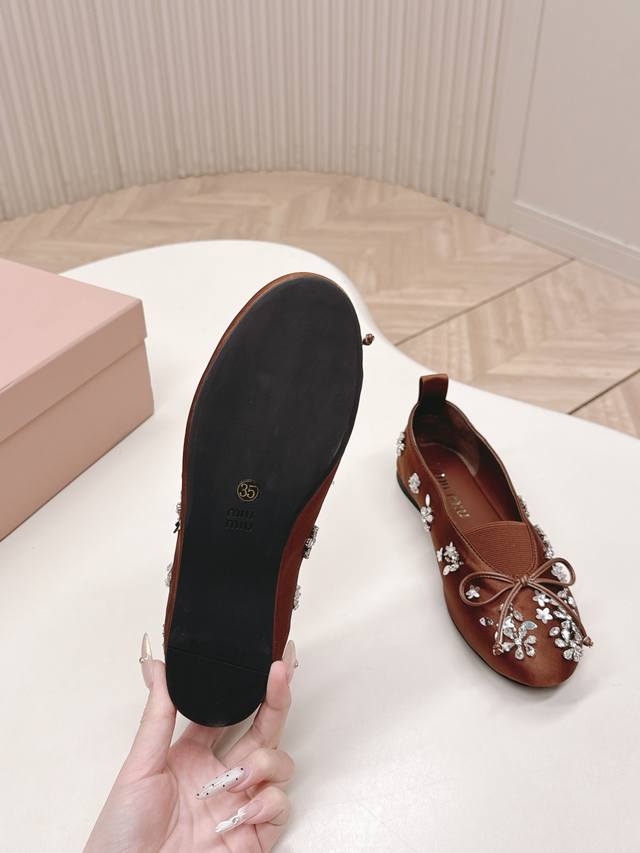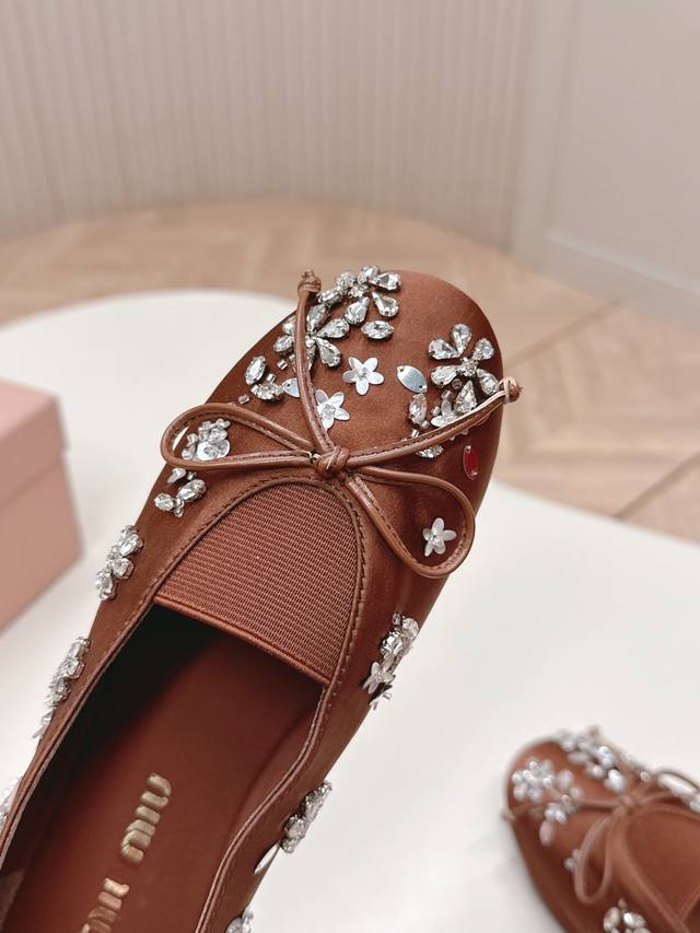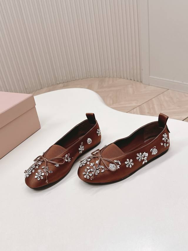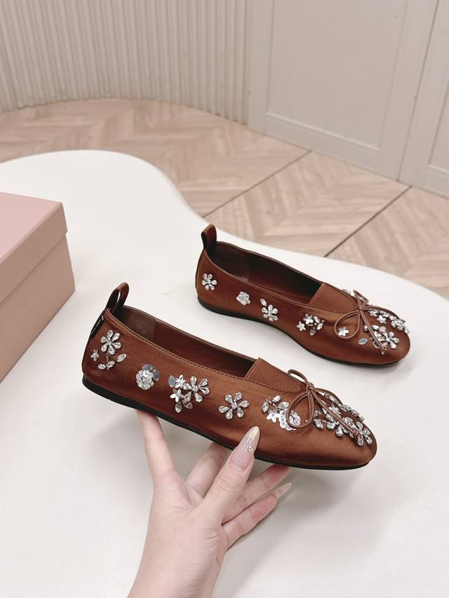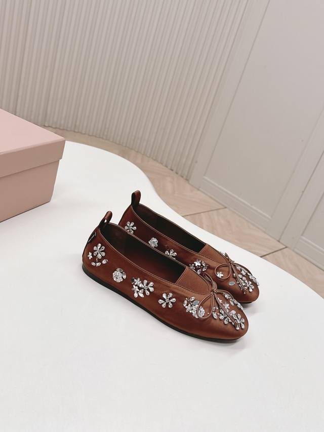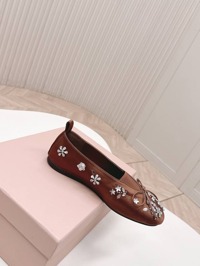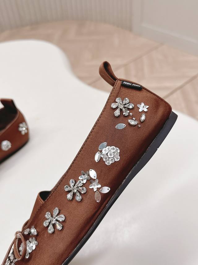 Selling Miu Miu 2026 Spring New Mary Jane Shoes. Versatile and slimming design. Three-dimensional and full shape, comfortable and stylish. Original satin upper with rhinestone flower design, high-end and elegant style, perfect details and trendy look. Upper: High-gloss satin upper; lining: sheepskin; insole; rubber outsole. Size: 35-40