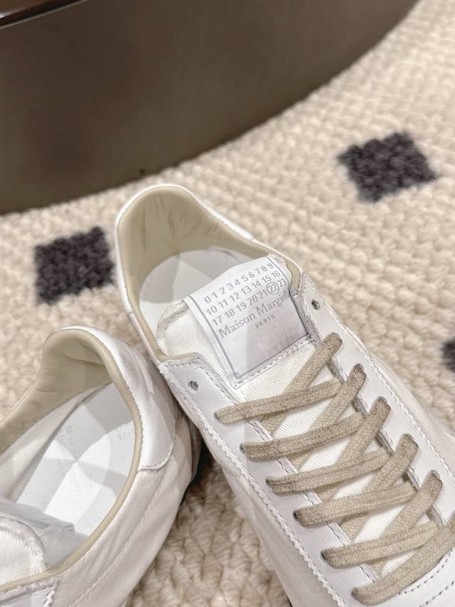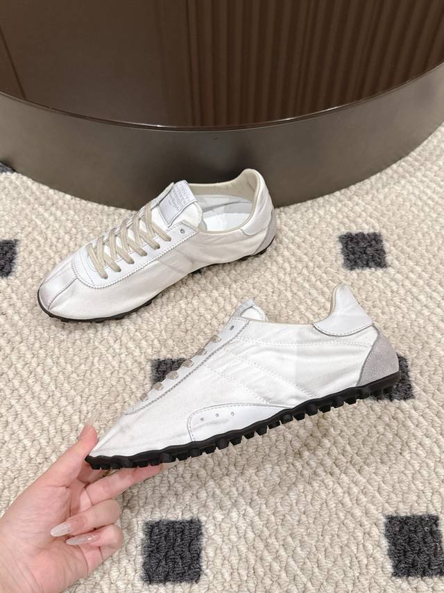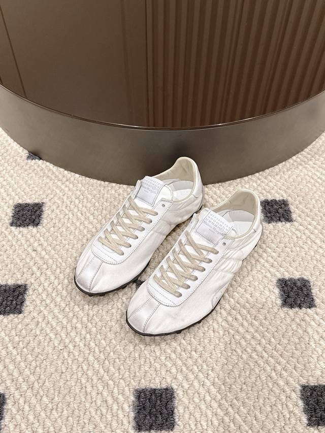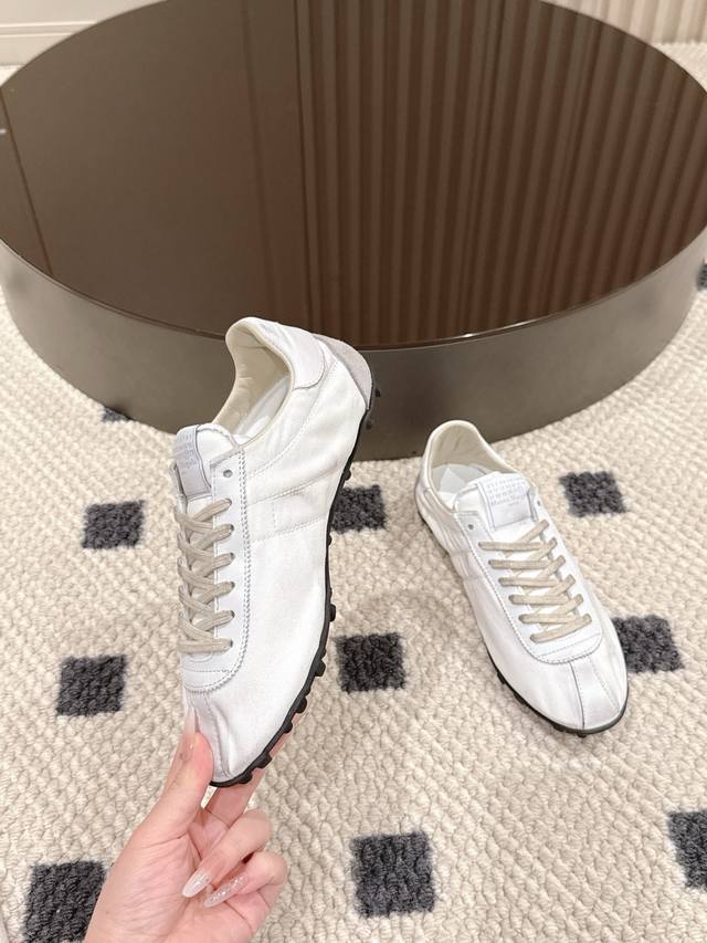Maison Margiela's new Spring/Summer 2025 collection has arrived. The new Sprinters sneaker silhouette is crafted from distressed nylon and vintage-treated suede, inspired by vintage running shoes. Through distressing, stitching, and patchwork, the pieces are imbued with new life and beauty. The tongue features the classic number logo, paired with a non-slip spiked sole and the signature white stitched logo on the heel, adding a touch of craftsmanship.