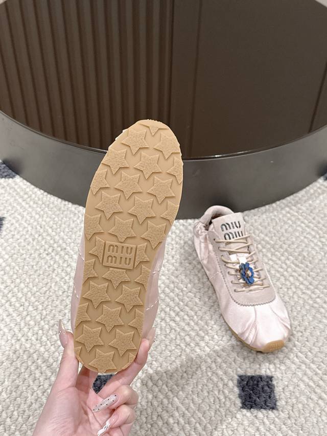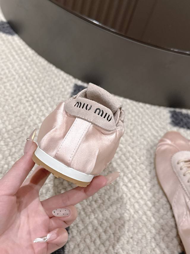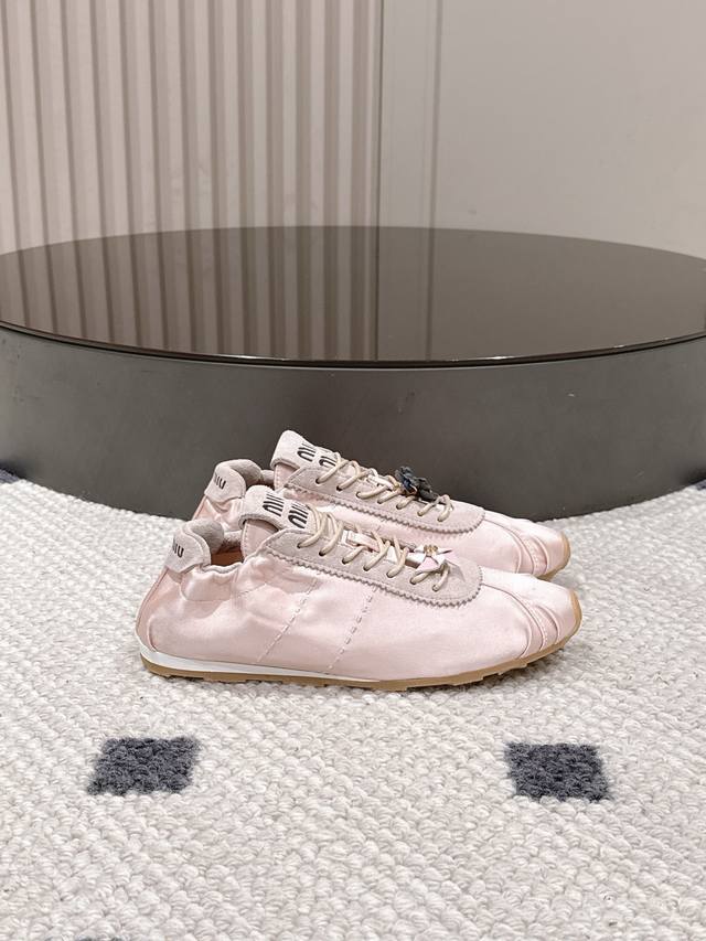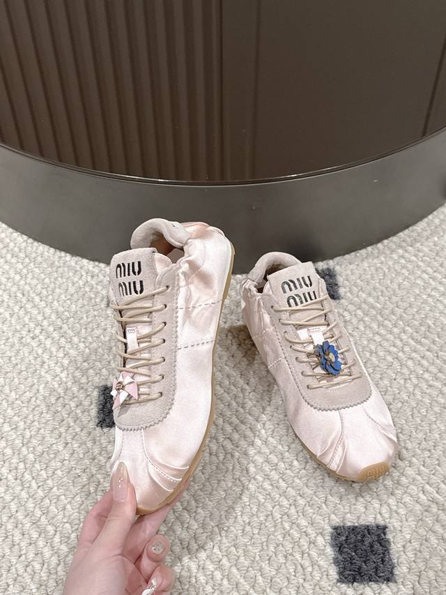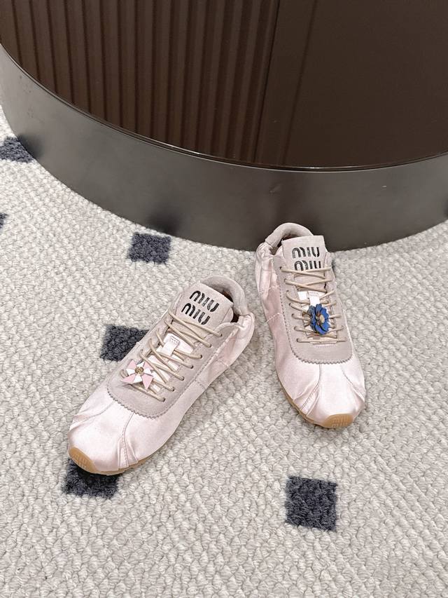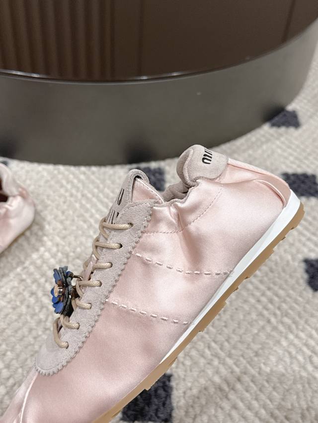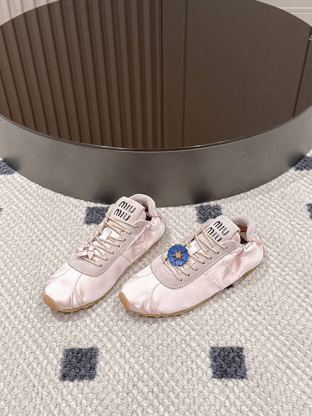 Sizes 35-40! Ddd's new Miumiu 26 plume satin sneakers perfectly embody the "sweet and edgy sophistication"! DDD The satin material has a built-in soft-focus filter, making it both gentle and luxurious; the small flowers and tassel embellishments on the shoe body are sure to capture a girl's heart, with exquisite details throughout. Available in four colors: light pink, ice blue, brown, and black, sweet girls can choose light pink and ice blue to pair with a tulle skirt, while cool girls can opt for brown and black to pair with cargo pants, easily switching between gentle and edgy styles. DDD These shoes make even walking feel like you're walking with a soft-focus filter; anyone who wears them will exude an aura of beauty! DDD #Miumiu26NewArrival #plumeSatinSneakers #SweetAndEdgyOutfit DDD
