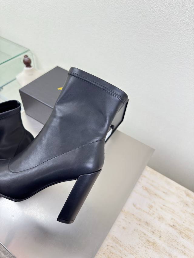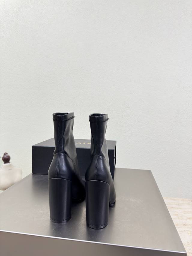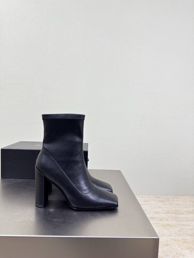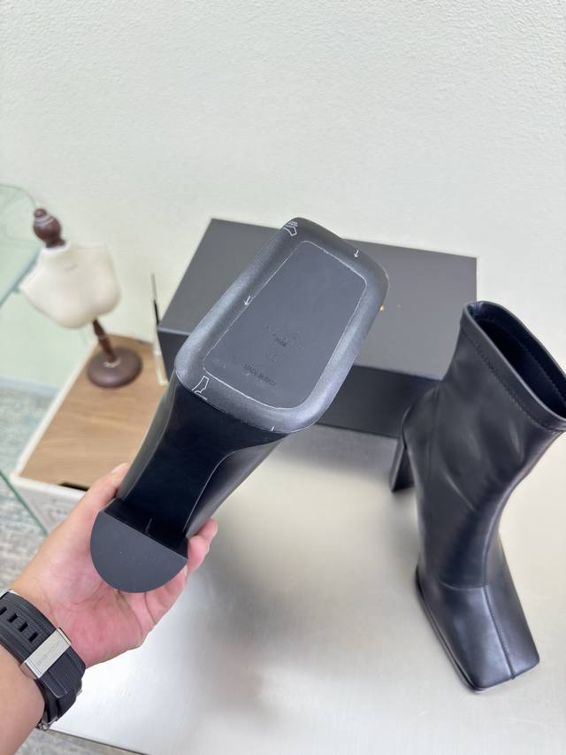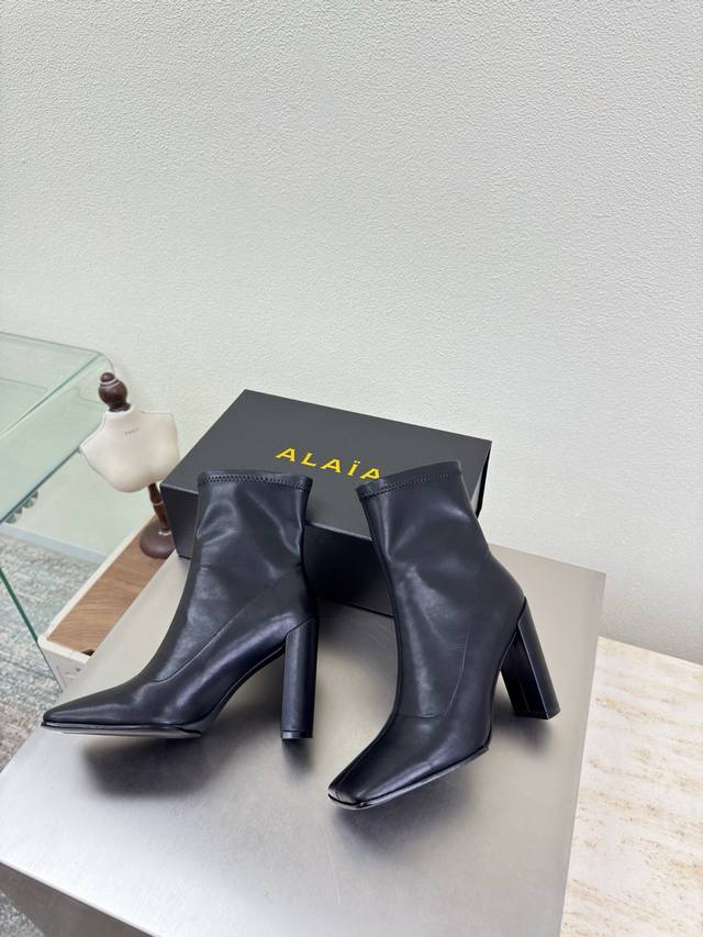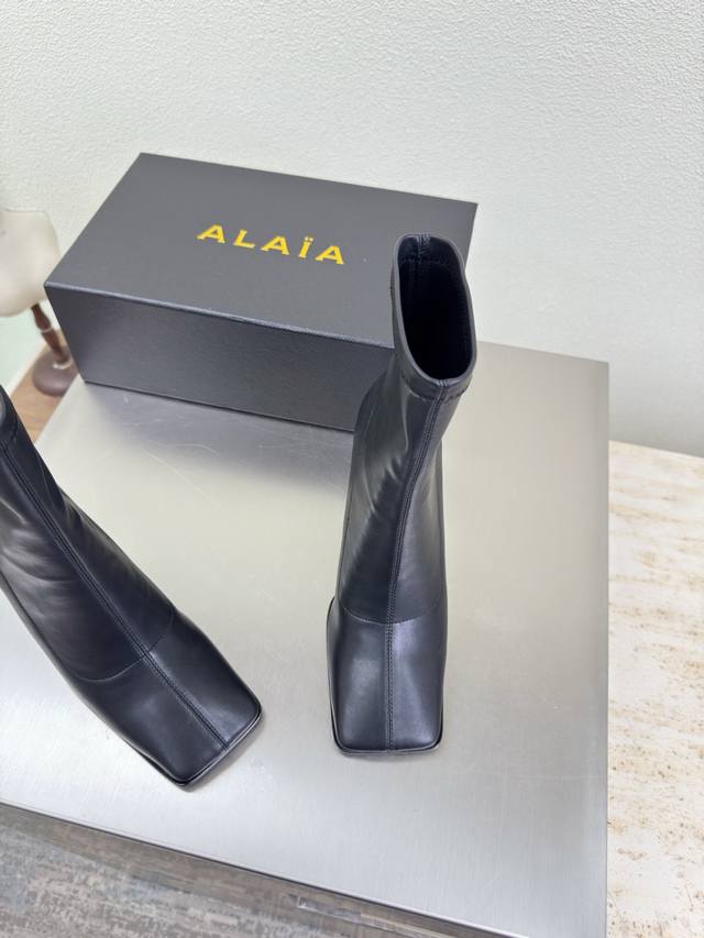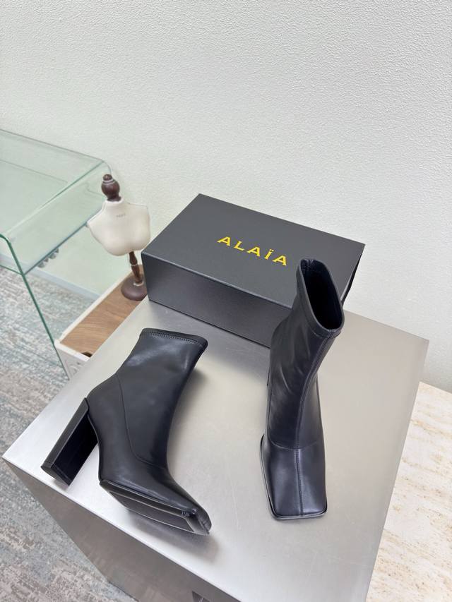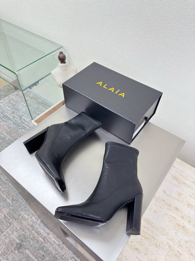 Slip-on stretch boots, made of high-quality fabric with a square toe and a 9cm heel. Alaia boots, perfect for slimming calves. Love at first sight from Paris. Black with stretch material. Alaia also has a sexy side. Easily paired with different styles and looks, whether it's jeans, suit pants, or a pleated skirt, these boots elevate your style to fashion, elegance, and sophistication. Features stretch material, sheepskin lining, and genuine leather outsole. Available in sizes 34, 35, 36, 37, 38, 39, 40, 41. Comes with original packaging.