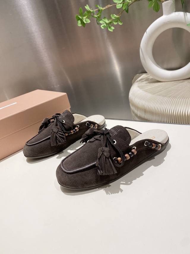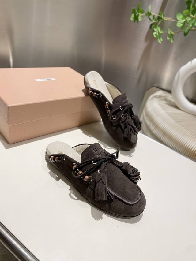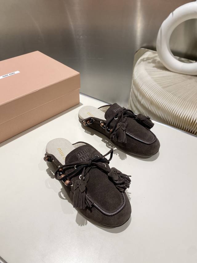 Slippers! Miu Miu 2025 distressed lace-up eyelet flat loafers with tassels, new runway style. Retro leather loafers, stylish, simple, and high-end, easy to match, very comfortable to wear, a must-have item of the year! Super heavy-duty craftsmanship, each pair is unique with distressed finish, original distressed cowhide upper, sheepskin lining, original outsole, sizes 34-41, 34, 40, 41, custom