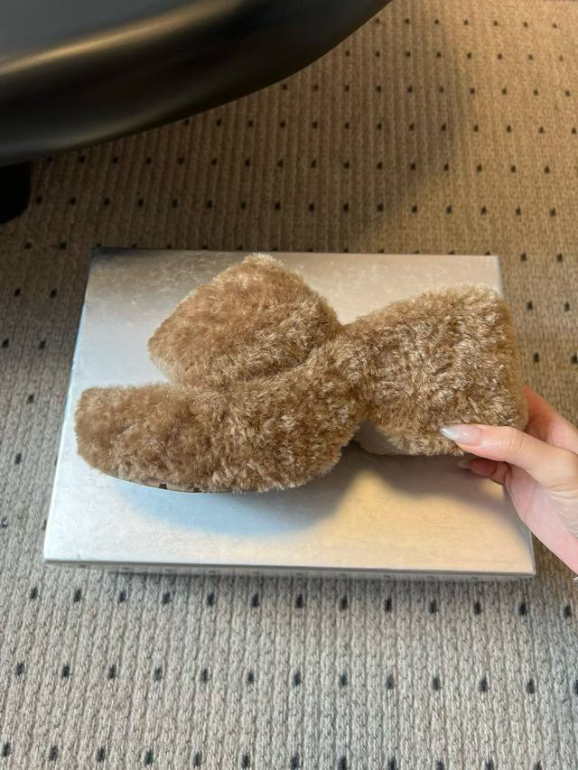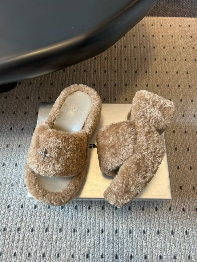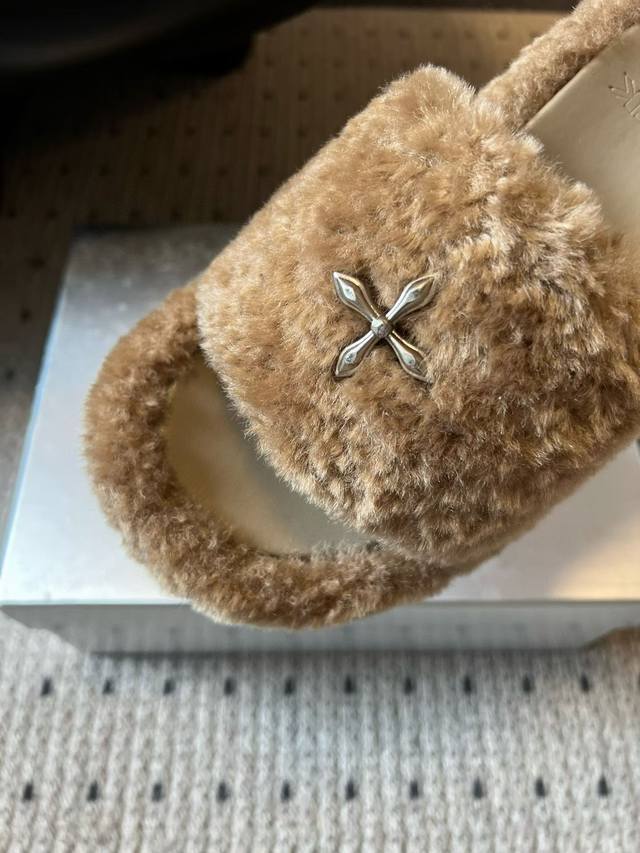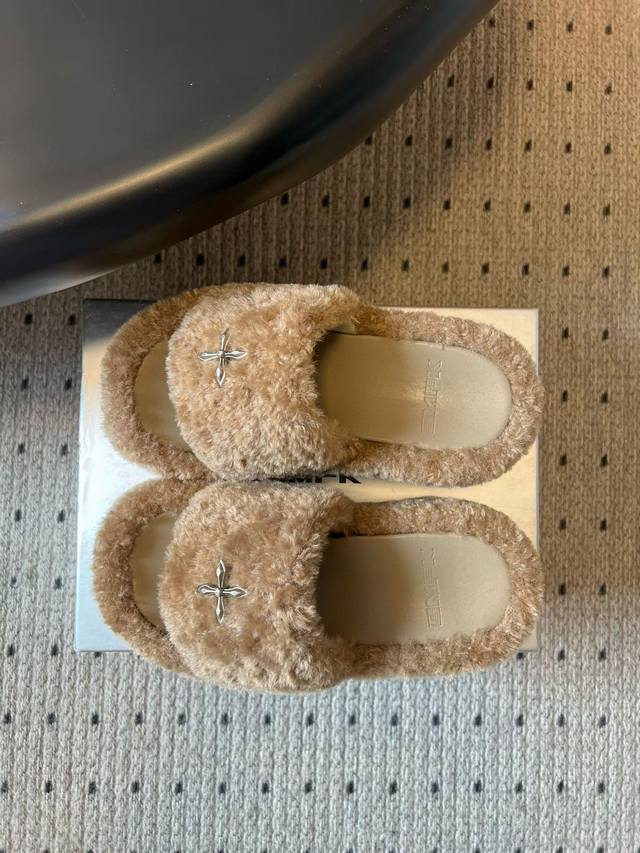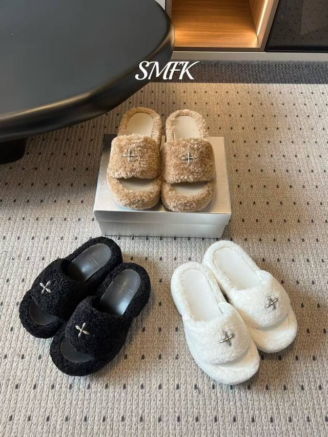 Smf* 25Ss Cross Statue Thick-Soled Plush Open-Toe Slippers DDD Made of faux lamb's wool, soft and fluffy to the touch, with good warmth; the upper is decorated with a metal cross, adding a sense of design and sophistication. These open-toe slippers have a casual and relaxed style, while the metal embellishments add a touch of sweet coolness, making them a fashionable item that can be worn both at home and outside. DDD Pair them with plush pajamas or loose gray loungewear in the same color family to enjoy comfortable and cozy moments at home without sacrificing style. Choose black denim shorts and a black fitted top, layered with an oversized gray sweatshirt, and black slippers for a casual yet cool street style. DDD Fabric: Knitted fleece DDD Lining: Sponge mesh DDD Outsole: Rubber outsole DDD Length: 9cm DDD Size: 35-40 Size 40 is custom-made and non-refundable DDD