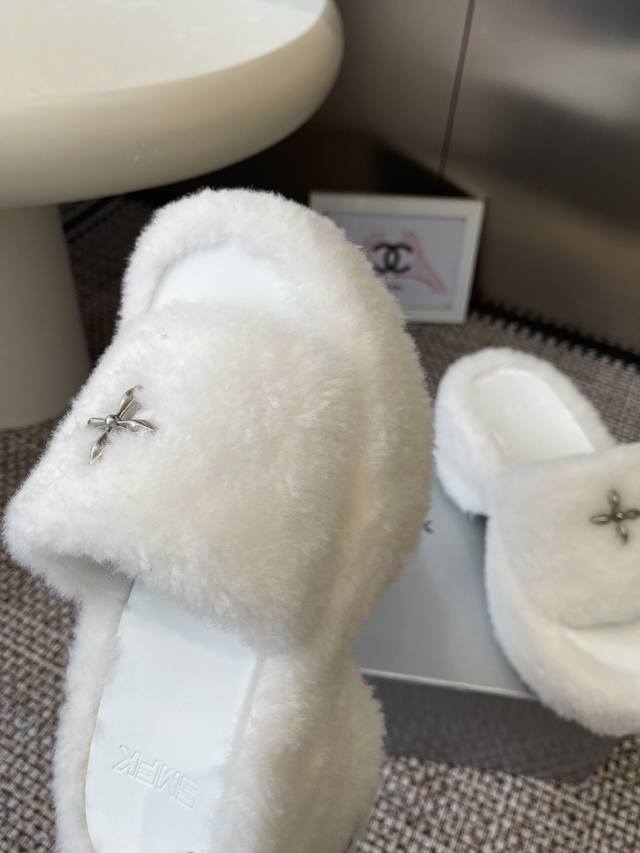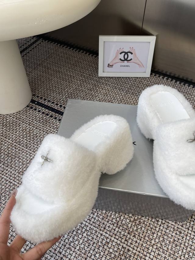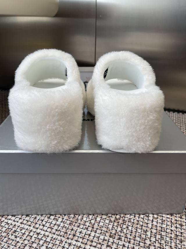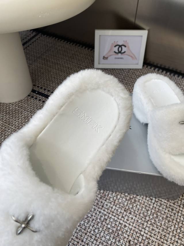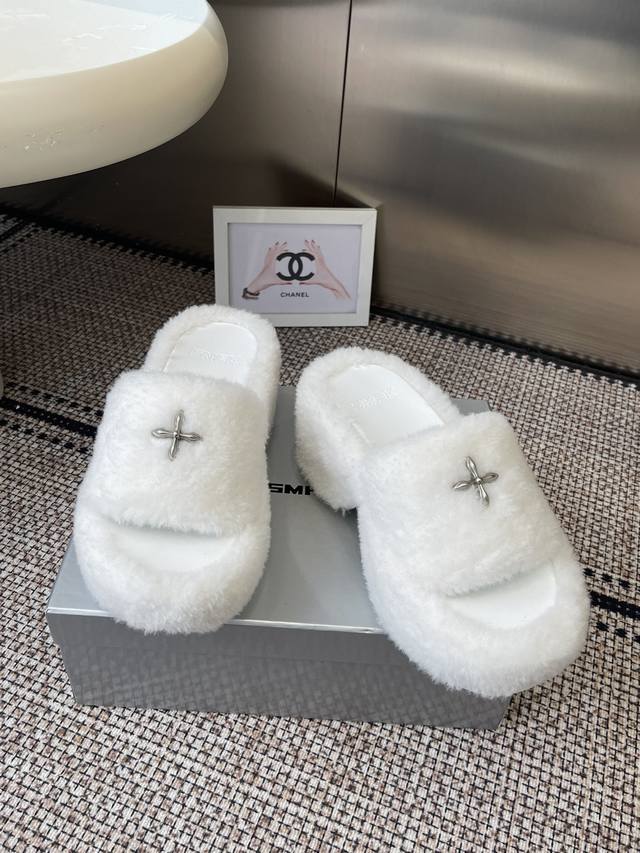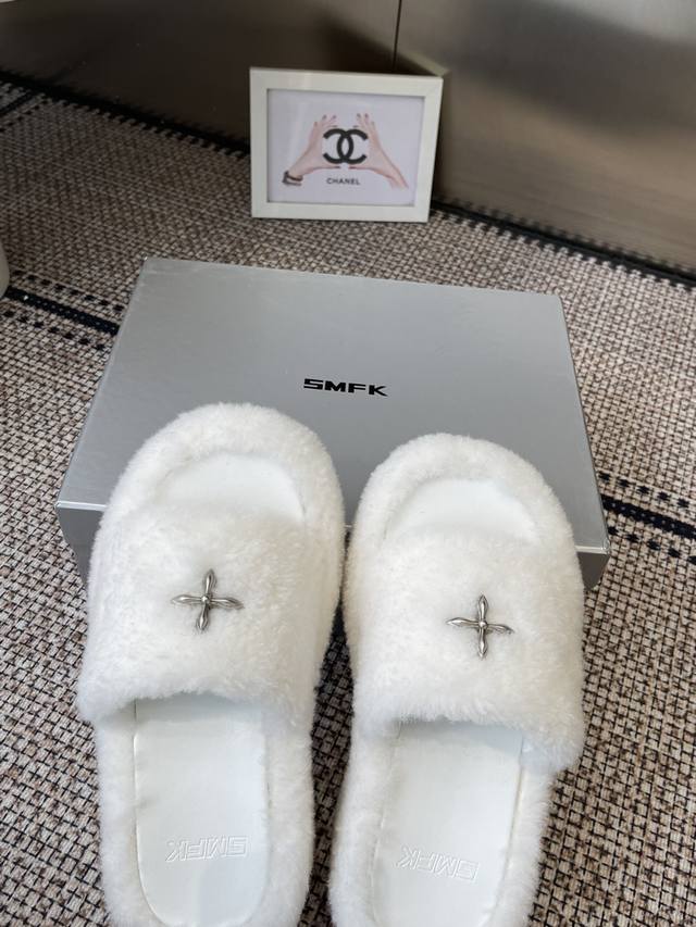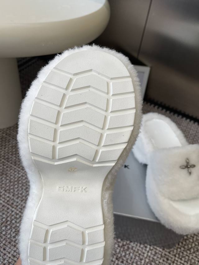 Smfk 25Ss Autumn/Winter New Thick-Soled Furry Slippers DDD Smfk Icon Furry High-Heeled Slippers feature an integrated design concept, using a single material to restore the overall aesthetic, further highlighting the original beauty of the structure and materials. Semi-handmade bonding and cutting maintains the traditional shearling process. The sole is fitted with an Smfk Wave rubber sole, and the upper is inlaid with a Compass cross-shaped metal badge. DDD Imported Icelandic wool fabric DDD Mesh lining DDD Original mold cross-shaped sole DDD Sizes: 35-40, 40 custom-made DDD