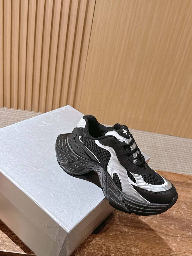 Made with a combination of mesh and leather, these shoes offer both breathability and a premium feel. The shoe features the brand's signature cross pattern, making them highly recognizable. The black and silver color scheme is cool and futuristic.