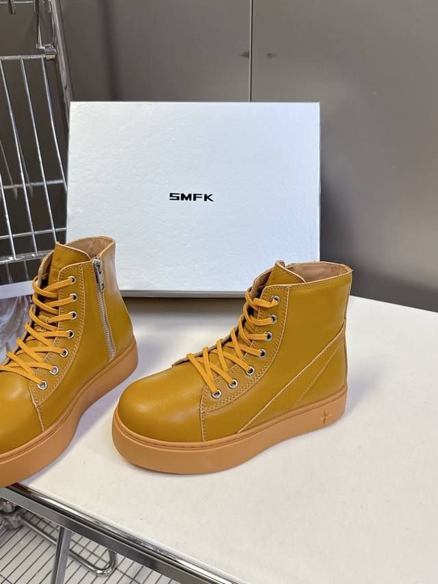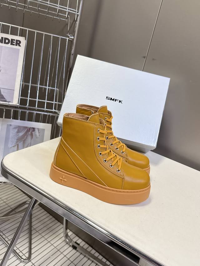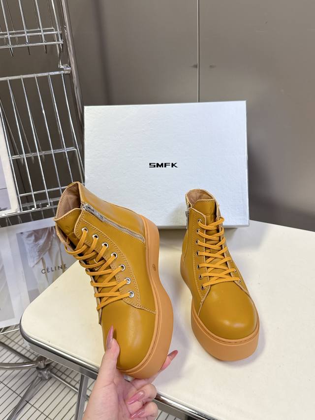Smfk, a domestic trendy brand, presents its latest autumn/winter thick-soled casual shoes and Martin boots. Recommended by numerous celebrities and fashion bloggers, this super popular domestic brand features a simple design with a cross logo, exuding a high-end feel. The quality is top-notch, making them a must-have for height enhancement. A very fashionable item that you'll love to look at; super versatile. 3cm outsole height. Original mold, non-slip outsole. Sizes: 35-40. Custom orders are non-refundable.