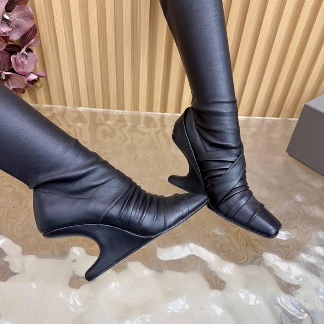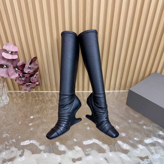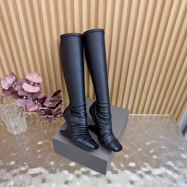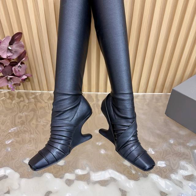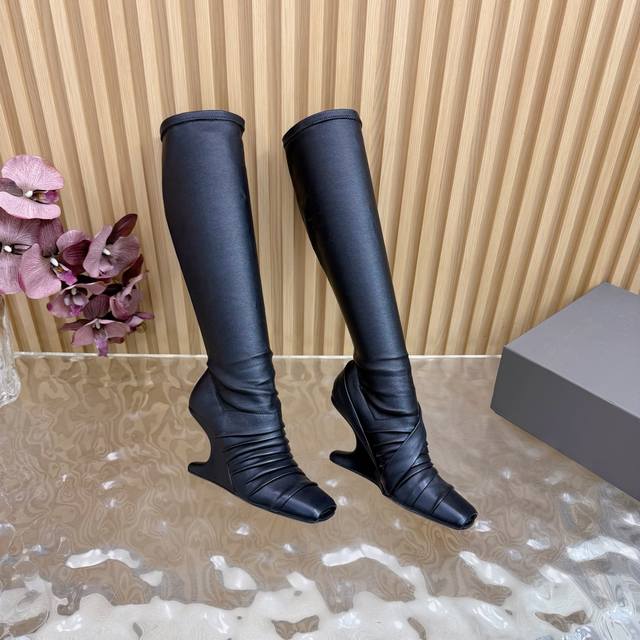 Smooth Ddd Horse Hair Ddd 2025 Autumn/Winter New Rick Owens High-Heeled Elastic Wedge Boots, Available Simultaneously with Fashion Show Ddd Cowhide and Sheepskin Patchwork Brown Sheepskin, Peep Toe Square Toe Design Ddd With Fur Patchwork Ddd Unique Details Ddd Brand New with Box Ddd Sizes 36-41 40.41 Custom Made Ddd