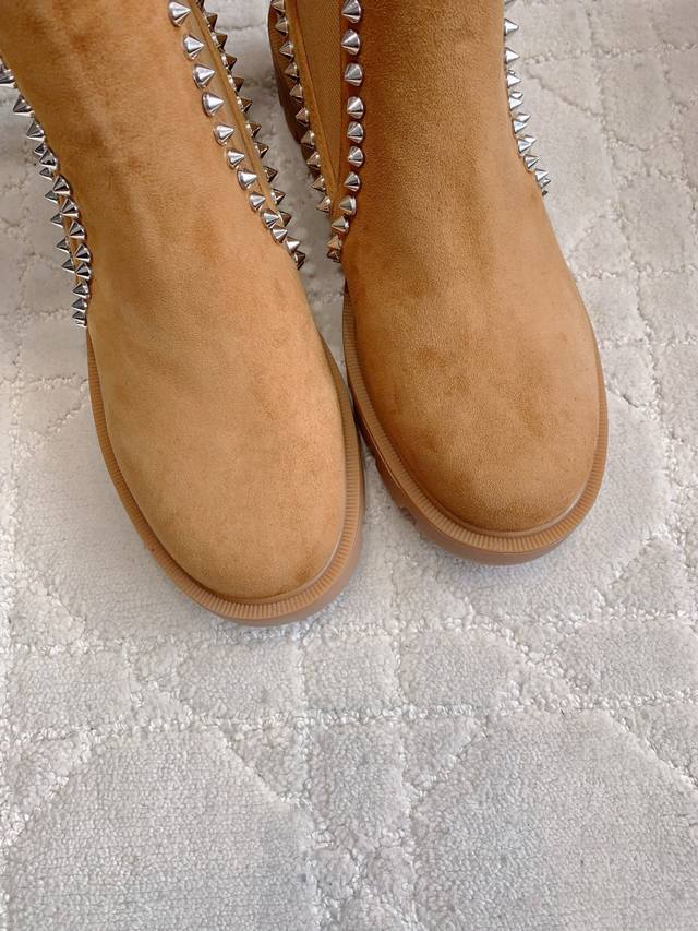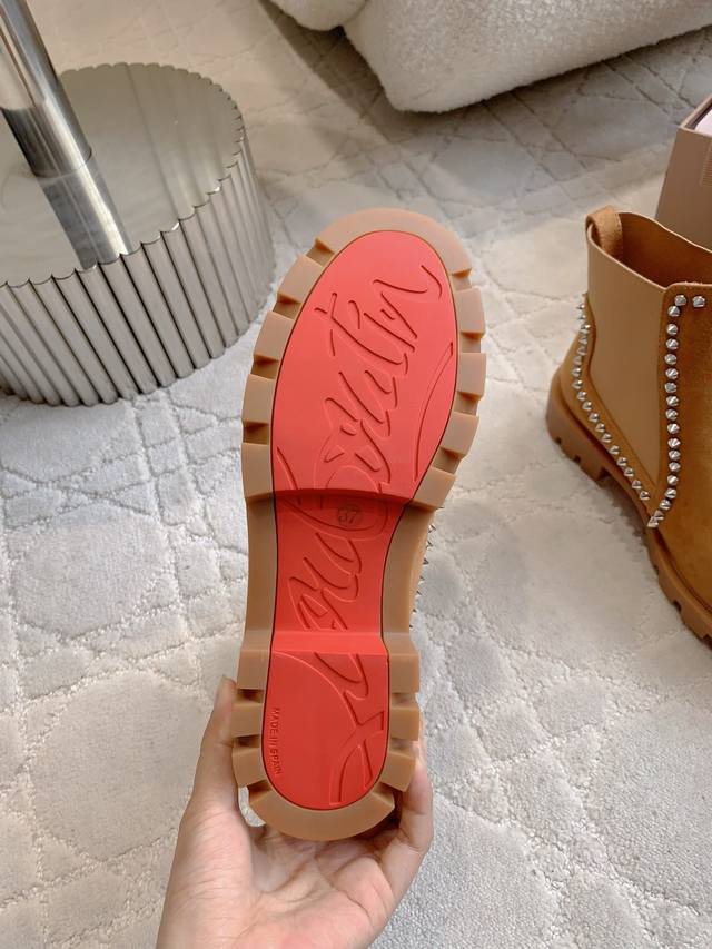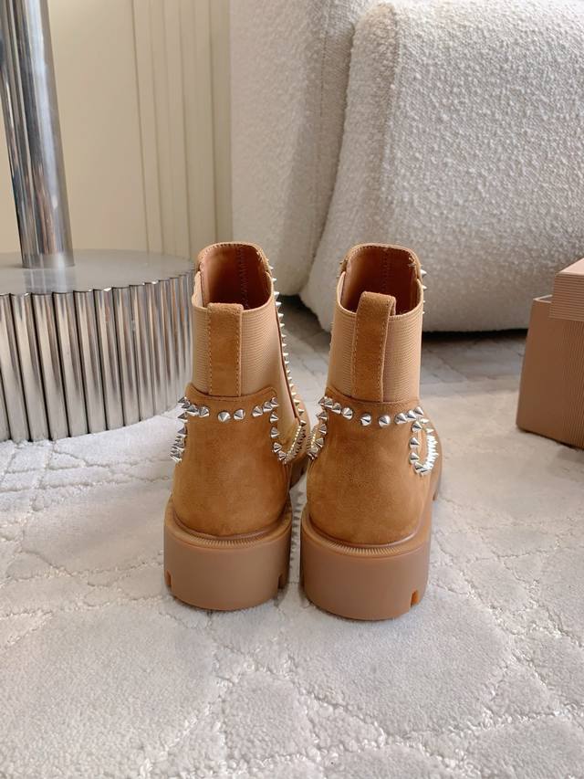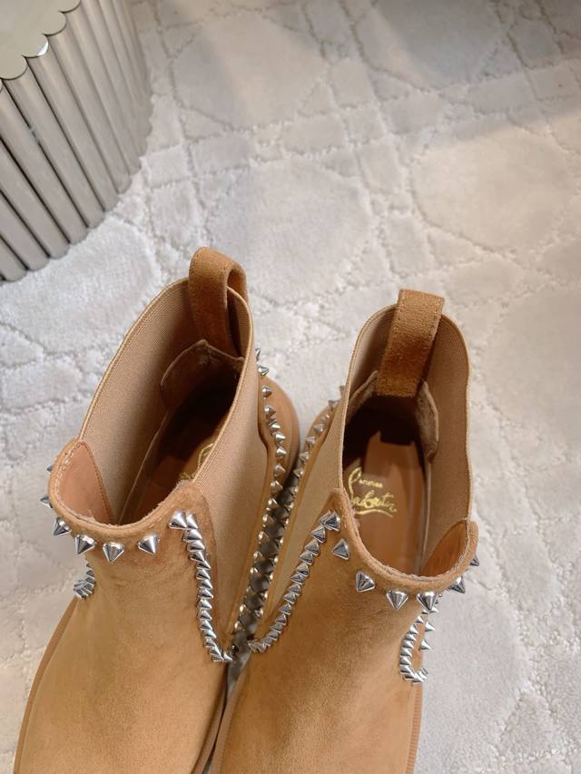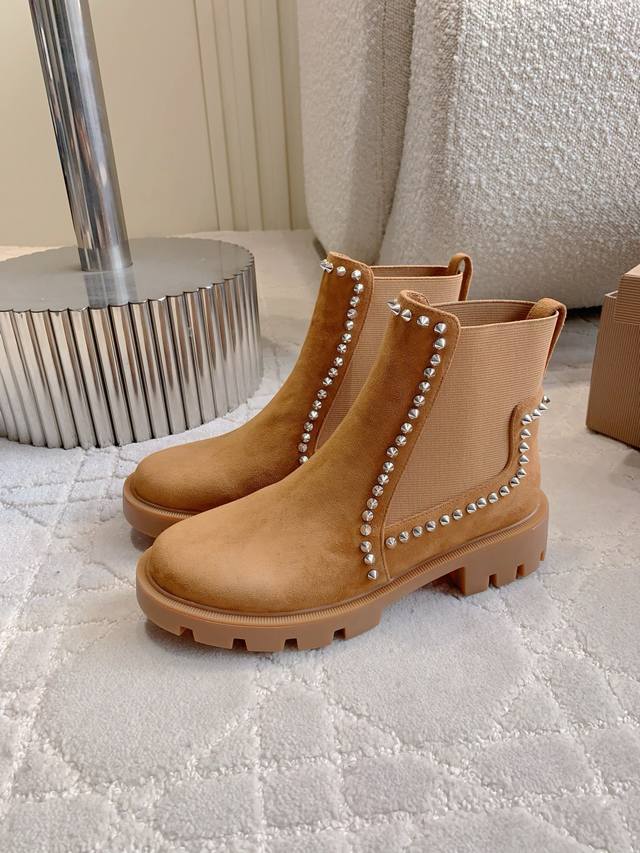 Smooth Rivet Christian Loubouti New Chelsea Platform Ankle Boots - Super Slimming, Versatile Autumn/Winter Essential, Comfortable and Comfortable. Upper: Cowhide, Sheepskin; Lining: Sheepskin; Insole: Original Molding; Outsole: 4cm Thick. Sizes: 35-39, 34, 40, 41, 42, 43. Custom Made.