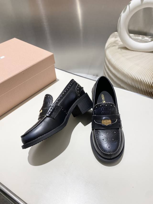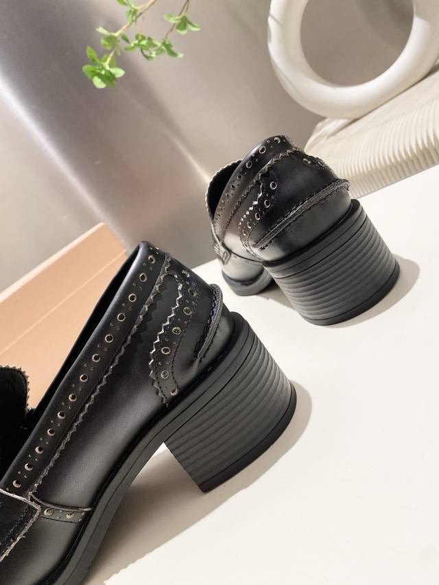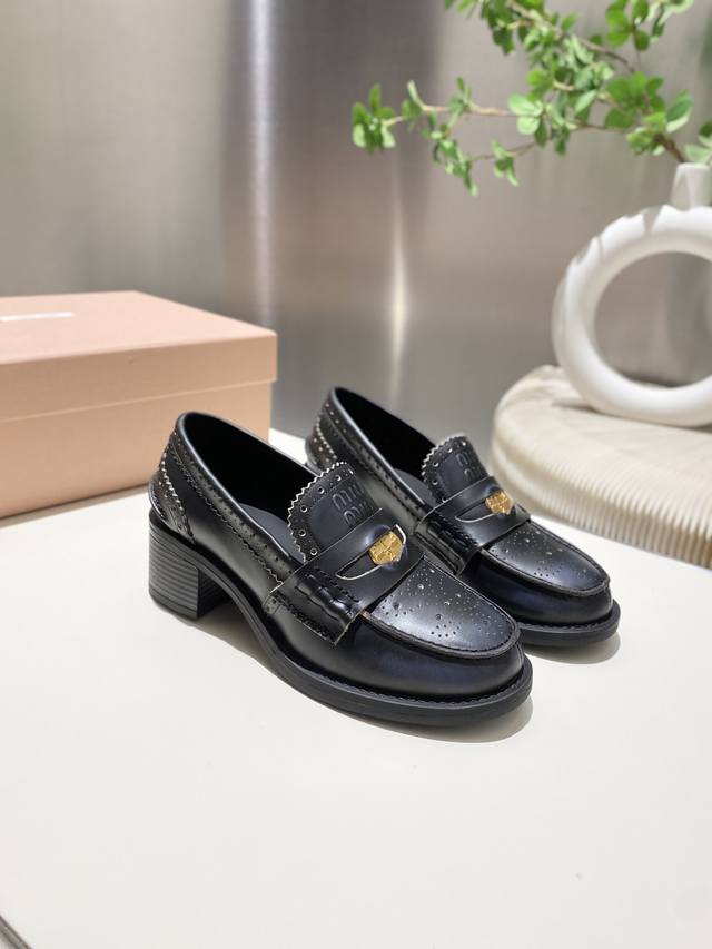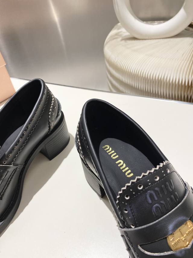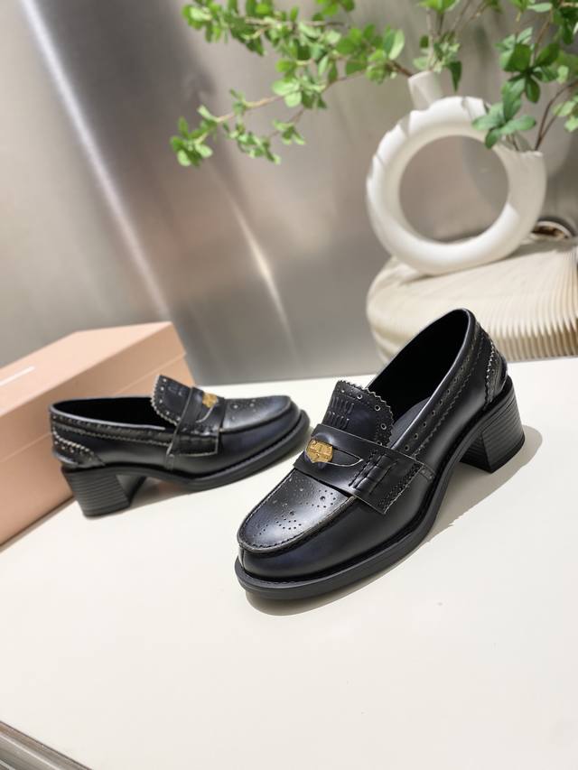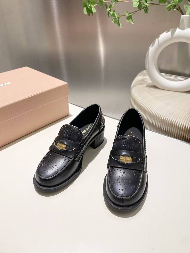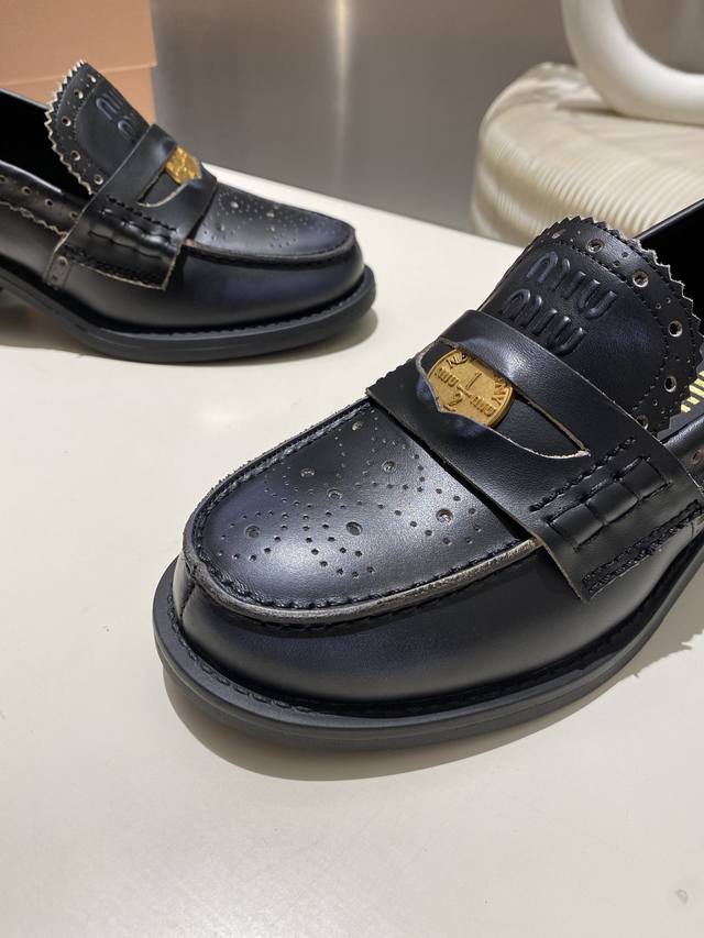 Split-edge beaded, distressed leather! 2025 Fall/Winter runway coin loafers! Miu Miu's latest collection is absolutely gorgeous! Incredibly stylish and versatile, the coin design is both retro and fashionable! The upper is made of original imported cow patent leather! The insole is lined with silk sheepskin! All leather edges are finished with oil-painted details. Original molded rubber outsole! Original molded coin hardware! Sizes 34-40. Sizes 34 and 40 are custom-made, no returns or exchanges.