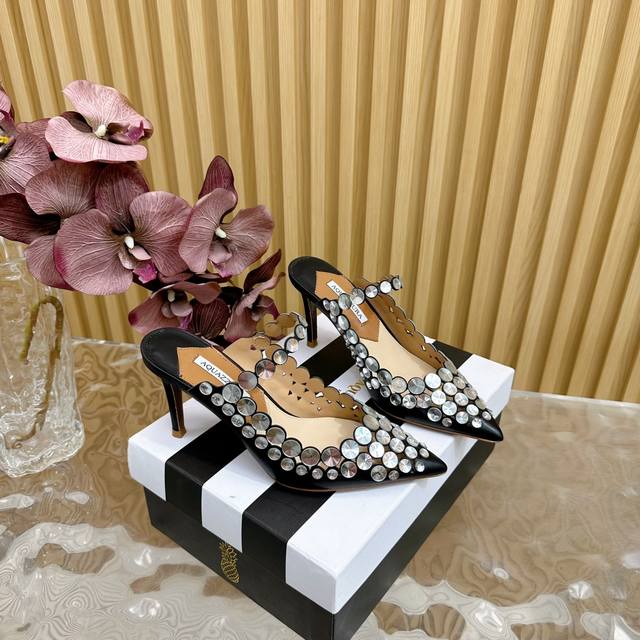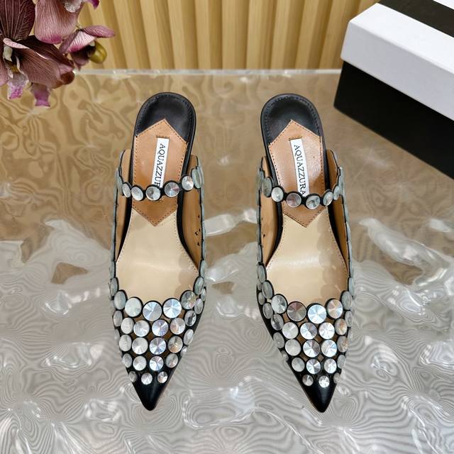 Spring/Summer New Arrival Aquazzura Zp Original Mold New High-Heeled Sandals. Made with original custom silk, featuring original molded Swarovski rhinestone embellishments, and a super sparkly gold pineapple logo on the outsole, giving the item a rich brand connotation and luxurious appearance. Genuine leather outsole and sheepskin insole. A must-have for fashionistas, these sandals boast beautiful, smooth lines and comfortable wear. Upper: Imported cowhide; Insole: Sheepskin; Outsole: Italian genuine leather; Heel height: 8.5cm; Sizes: 35-39 (35, 41, 42, 43 are custom-made and non-refundable).