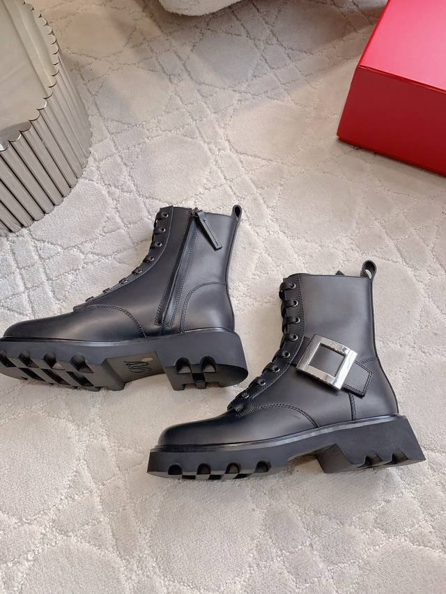 Roger Vivie*s new square buckle thick-soled lace-up short boots. Classic square buckle decoration, luxurious and elegant. Classic and versatile style. Lightweight, comfortable and not heavy.