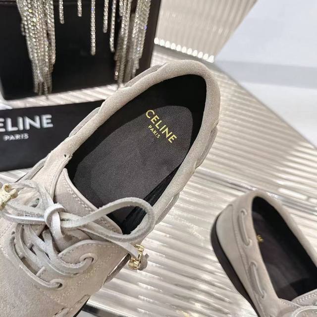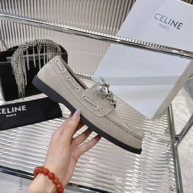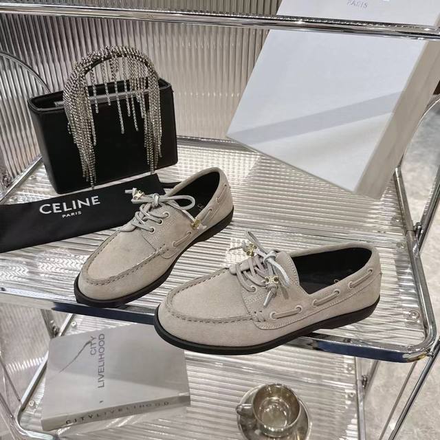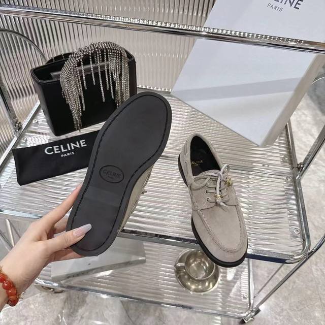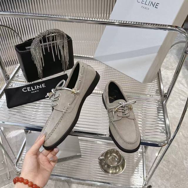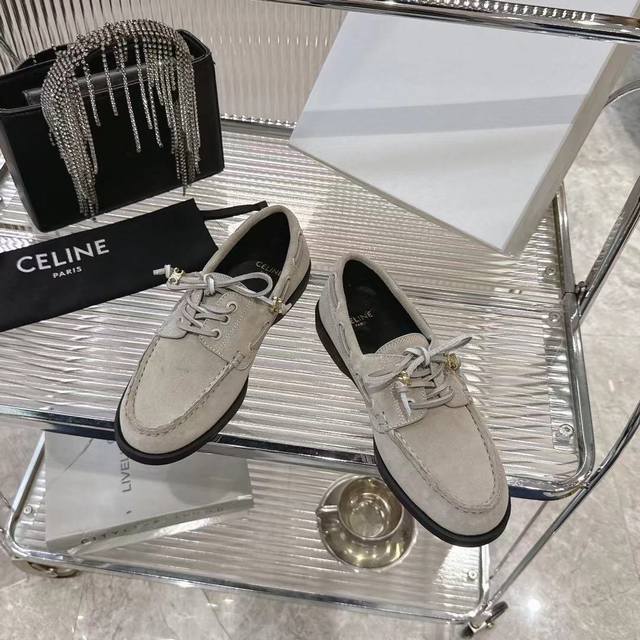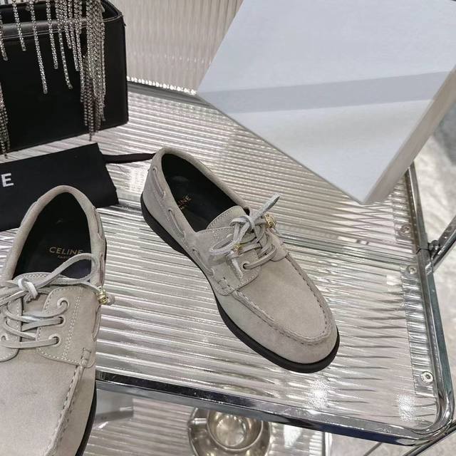 The classic Celine Bateau boat shoe returns! Wrapped laces create a casual silhouette, retro eyelets add detail, and a durable rubber sole keeps you comfortable on the go. Minimalist design meets exquisite craftsmanship, creating a relaxed French vibe and a sophisticated everyday look. Available in sizes 35 to 41, with the size 41 custom-made and non-refundable. Factory price: p yuan.