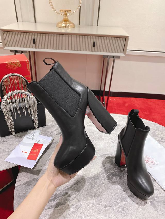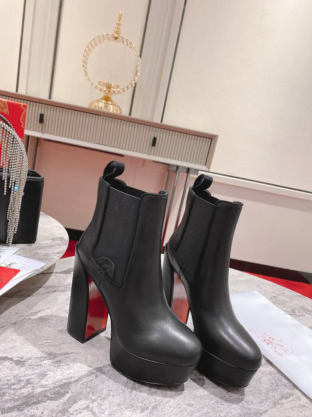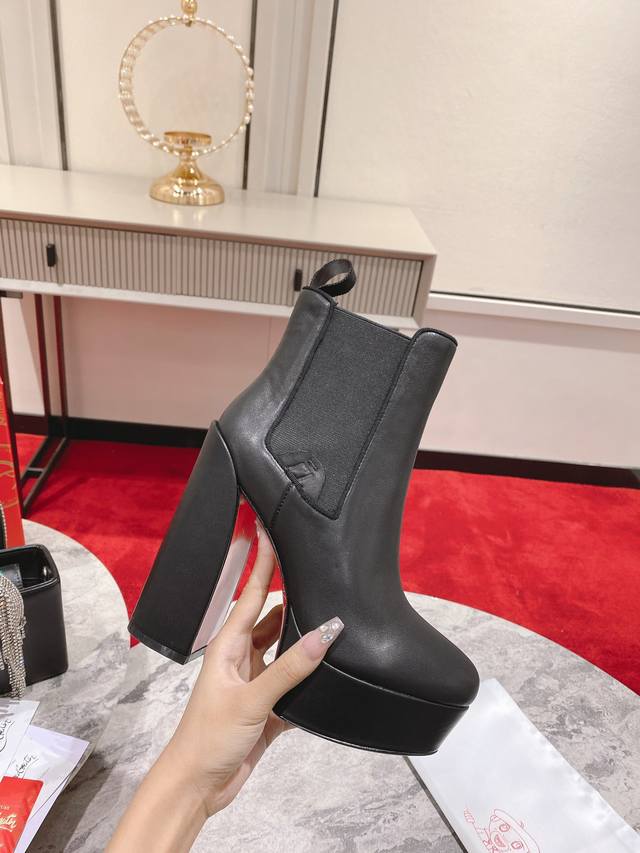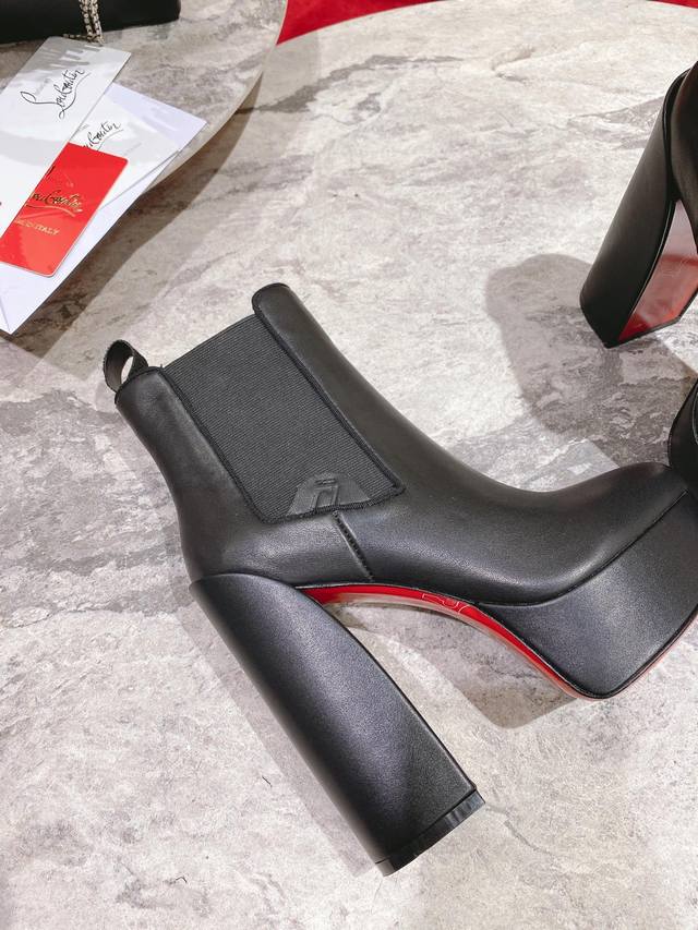 The Movidastic is a sophisticated ankle boot with a 130mm thick horned heel. Crafted from black calfskin, this boot showcases Maison Christian Louboutin's expertise with clean lines. It features a curved toe and a flexible insert on one side, reinforced with an embossed Cl Varsity logo. Material: Imported calfskin; Full sheepskin lining and insole; Italian genuine leather outsole. Sizes: 35-42 (40, 41, 42. Made to order, no returns or exchanges). Color: Black. Heel height: 13cm.