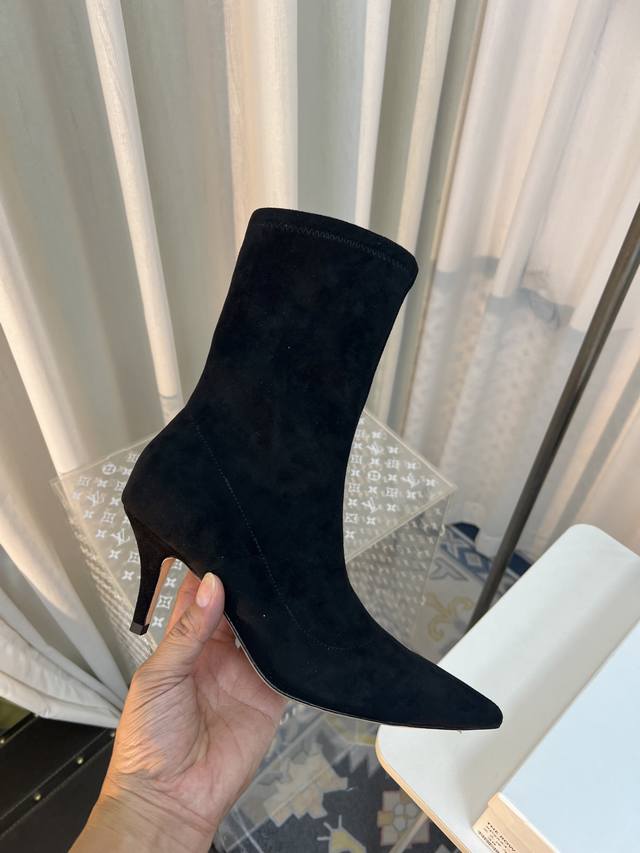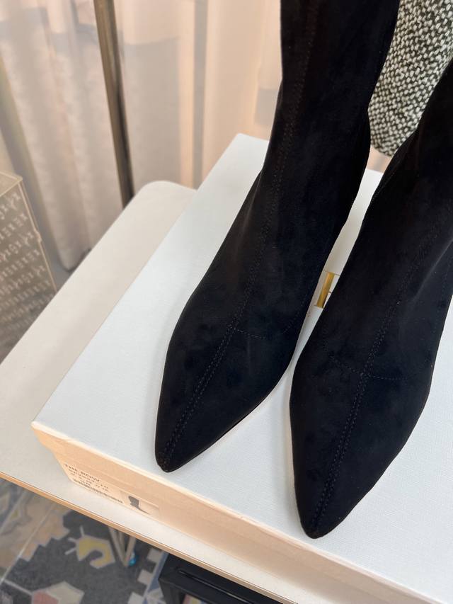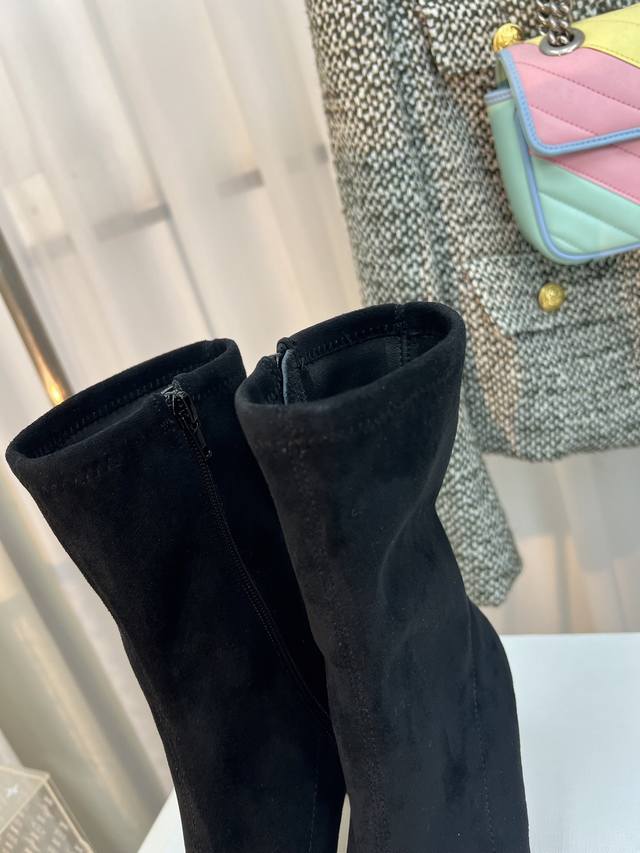 Made of elastic suede material, this material not only conforms to the leg lines and effectively modifies the leg shape, making the legs look longer and smoother, but the suede material also has a high-end matte texture, adding a touch of luxury and retro atmosphere to the boots. The boot shaft height is in the mid-high range, covering the calf area, which has a certain degree of inclusiveness and modification effect on the calf line.