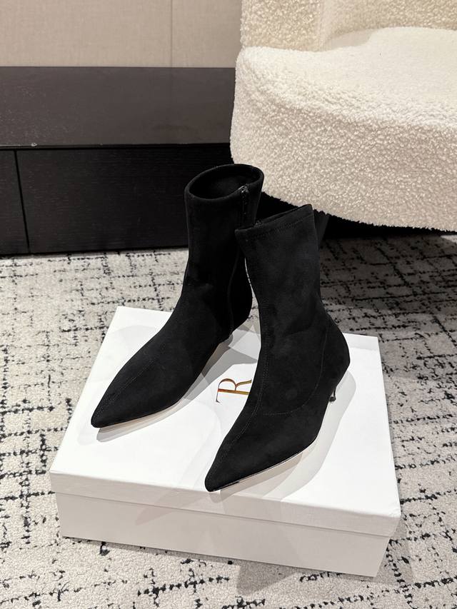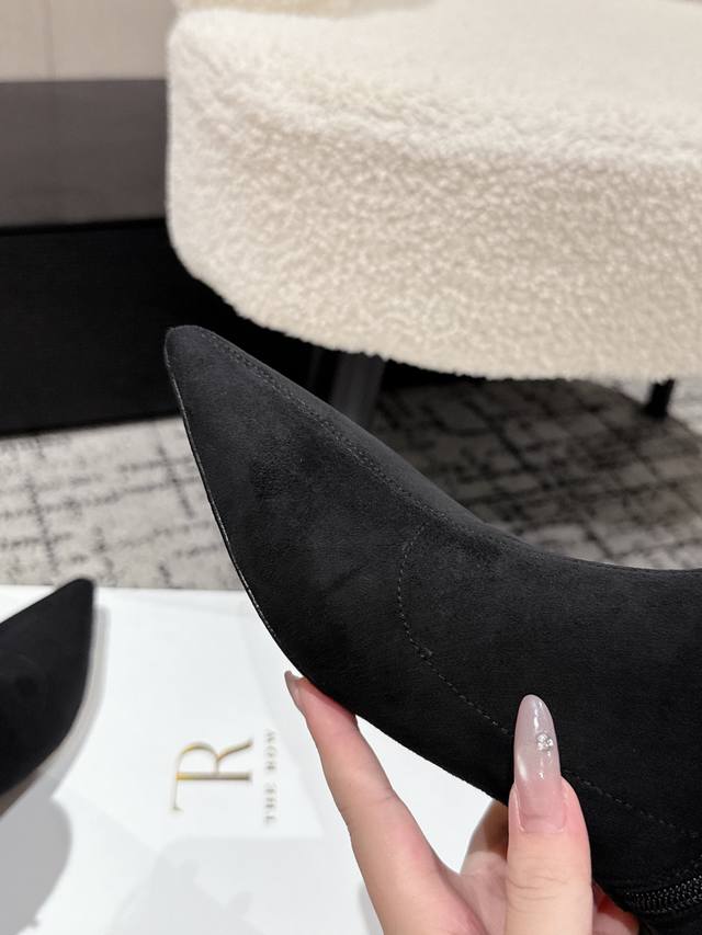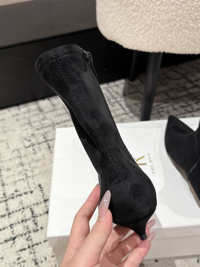 Made of elastic suede, this material not only conforms to the leg lines and effectively modifies the leg shape, making the legs look longer and smoother, but the suede material also has a high-end matte texture, adding a touch of luxury and retro atmosphere to the boots. The boot shaft is in the mid-high range, covering the calf area, which has a certain degree of inclusiveness and modification effect on the calf line.