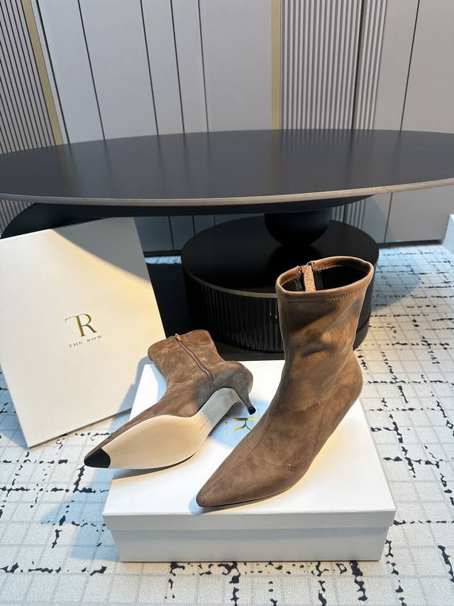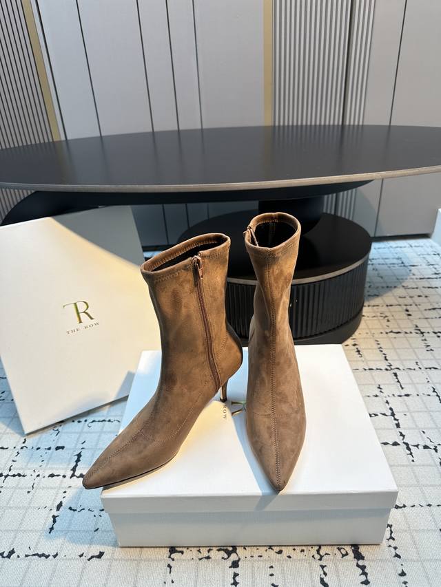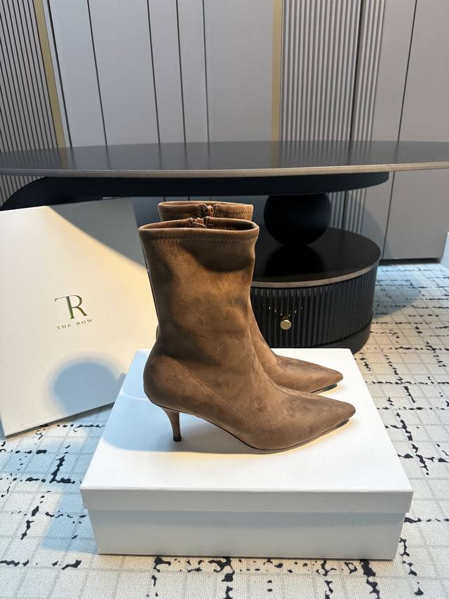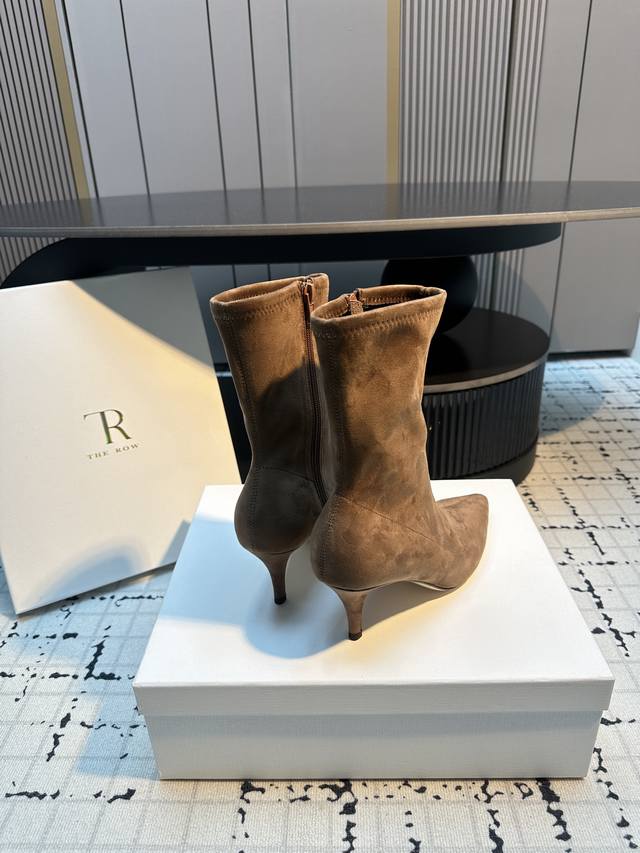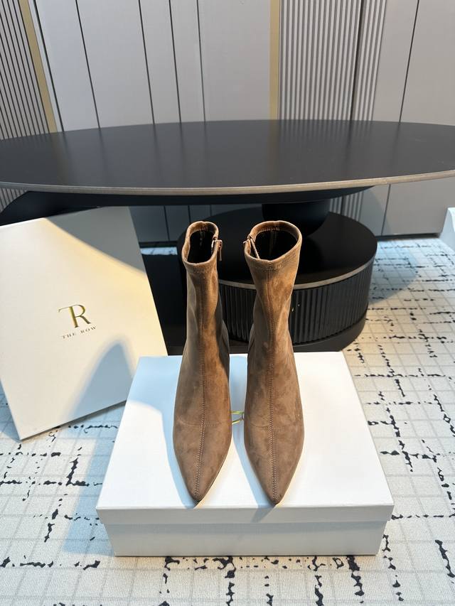 The Row New High-Heeled Pointed-Toe Ankle Boots DDD Made of a suede-like material with a delicate texture. The boots feature a slim-fitting short shaft design with a side zipper for easy on and off, and fit the ankle perfectly. The pointed toe adds a touch of sophistication; the stiletto heel enhances the overall elegance and feminine charm. DDD Pair them with black skinny jeans or a leather skirt and a blazer for a sharp, professional look; or with a black velvet dress for a retro-chic evening style. DDD Upper: Stretch fabric DDD Lining: Sheepskin DDD Outsole: Genuine leather outsole DDD Sizes: 35, 40 Size 40 is custom-made, no returns or exchanges DDD