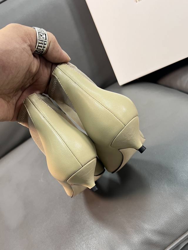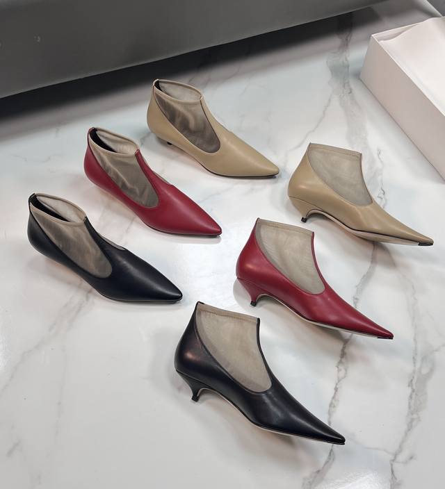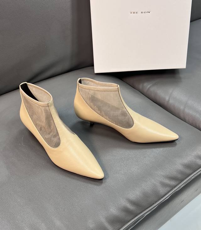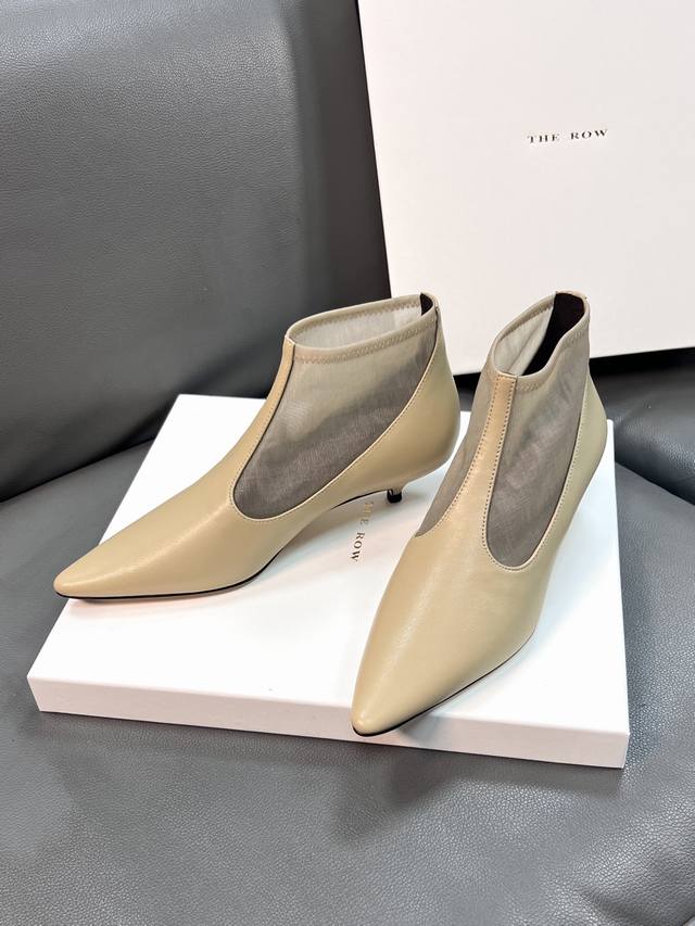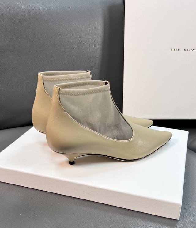 The Row Spring/Summer 2025 Collection These pointed-toe kitten heel ankle boots perfectly embody minimalist luxury, once again showcasing the brand's restrained and haute couture spirit. Crafted from exquisite mesh fabric, they form a sculpted silhouette that hugs the leg's lines. Sheer nylon mesh gently wraps around the boot, creating an architectural yet feminine look, contrasting a slender silhouette with a sense of power. While retaining The Row's signature "Silent Luxury" aesthetic, these boots break new ground in structure and materials, adding tension to minimalism. They can be paired with oversized tailored suits or flowing dresses, injecting a cool yet sensual tension into spring/summer looks. Available in two heel heights: 3.5cm and 8.0cm. Features an Italian leather outsole and injection-molded rubber toe cap. Sizes 35-41. Ankle Boots.