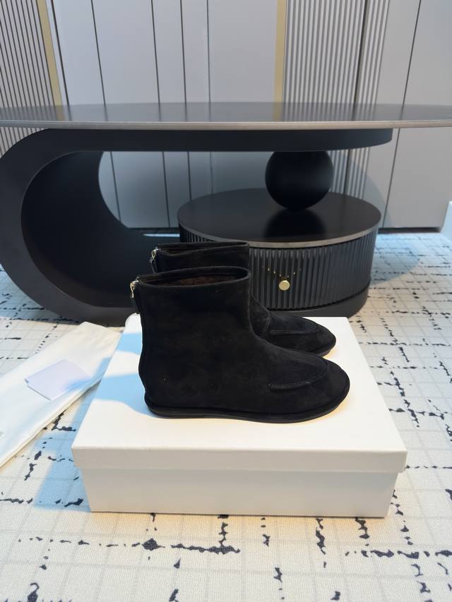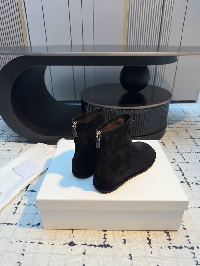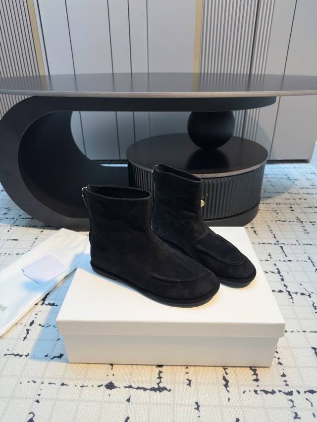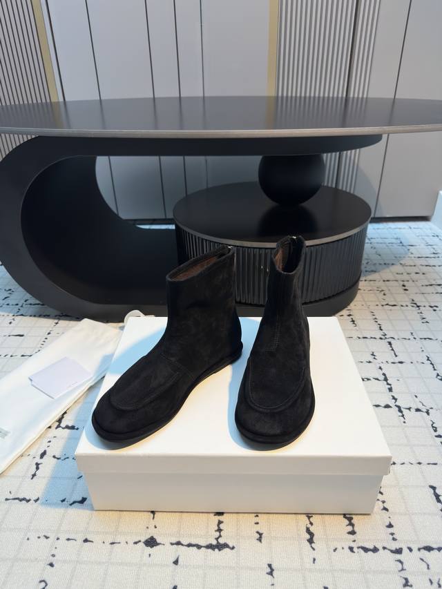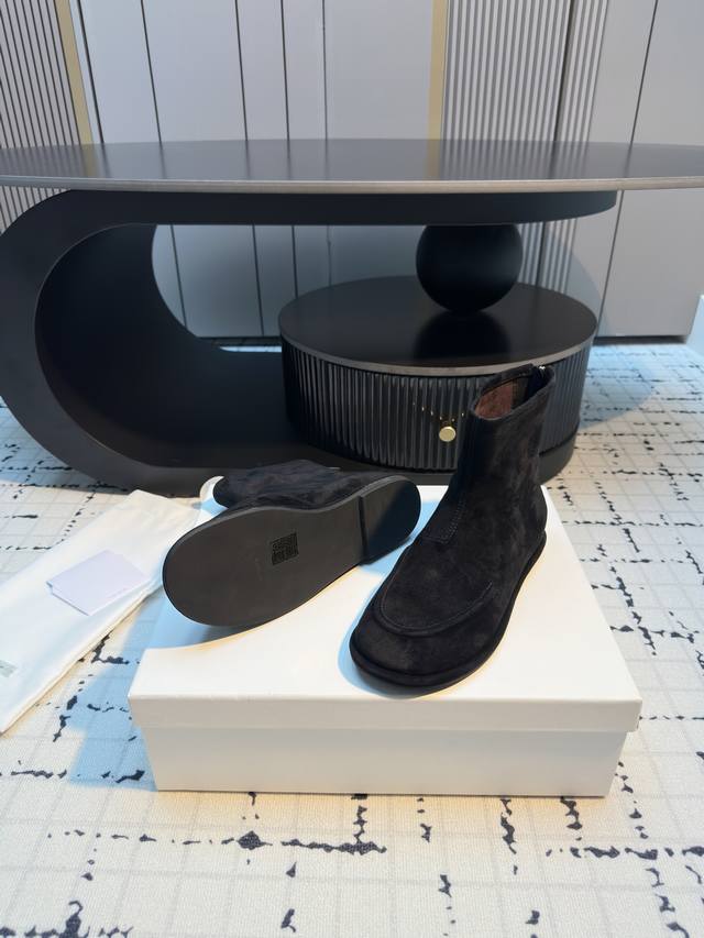 The Row's classic retro round-toe flat ankle boots. Their minimalist design evokes a sense of quiet sophistication, becoming the unspoken secret for those who appreciate quality. The round toe is a gentle footwear statement, perfect for every foot shape. The boot's shaft neatly wraps around the ankle, extending from toe to cuff. The lack of unnecessary embellishment, yet a sculptural silhouette, is The Row's signature aesthetic. It's a versatile wardrobe essential. Made from custom-made leather, the boot's lining is lambskin. Custom-made, non-slip soles are custom-made from the original mold. Sizes: 35, 41, 40, and 41. Made to order, no returns or exchanges.