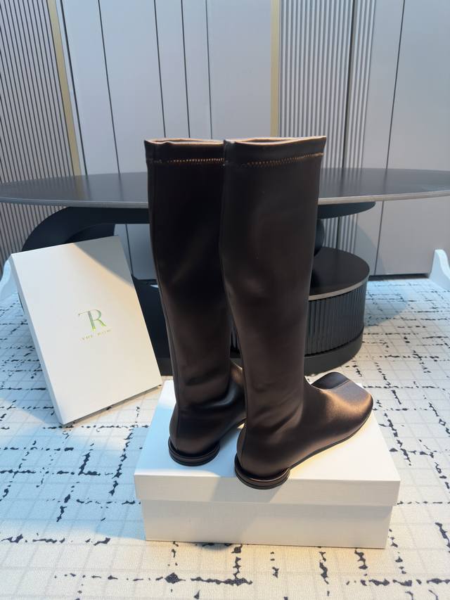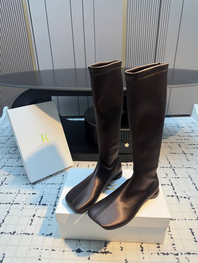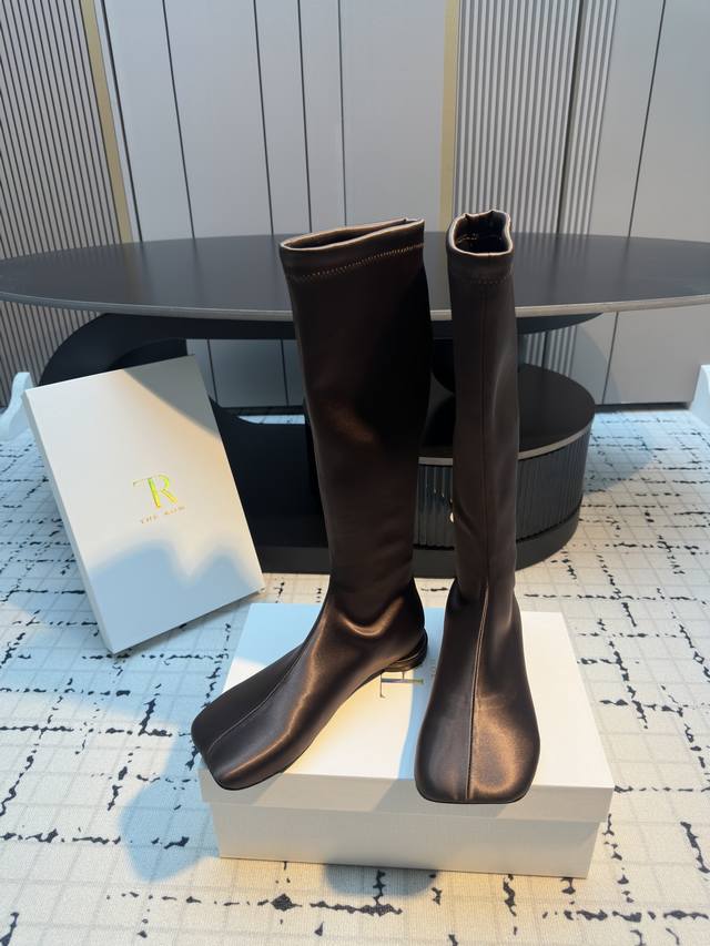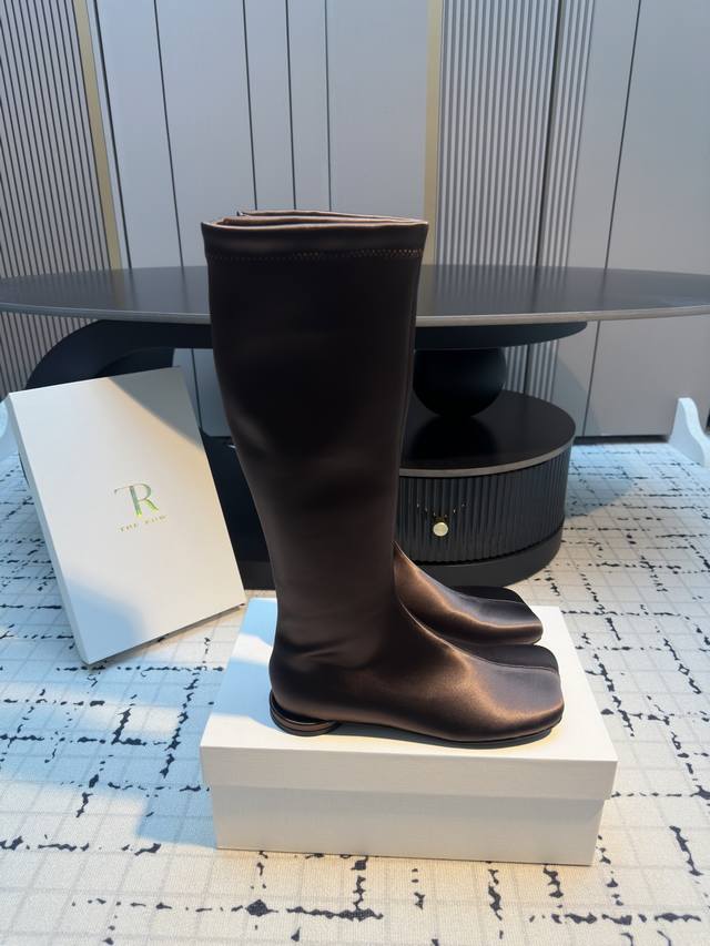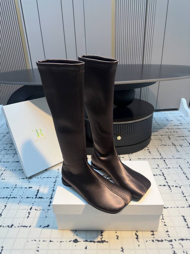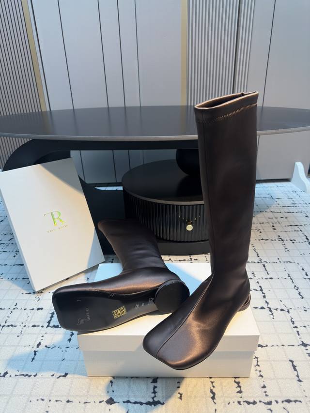The Row's new 2025 early autumn design, crafted from high-quality lambskin with an exquisite texture, offering an incredibly soft touch. The clean lines of the cut conceal any unwanted curves. The unique square toe and exaggerated round heel design not only align with current trends but also subtly elongate the legs. The elasticated boot opening conforms to the leg shape, making it suitable for both commuting and dates. It perfectly captures the early autumn vibe. Material: Elastic laminated lambskin, silk satin. Sole: Italian genuine leather. Lining: Lambskin. Heel height: 1cm. Shaft height: 15.5 inches (38cm). Sizes: 35, 41, 40, 41. Custom orders are non-refundable and non-exchangeable.