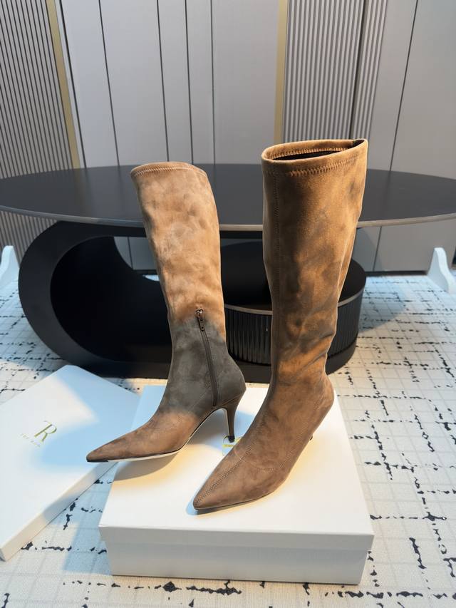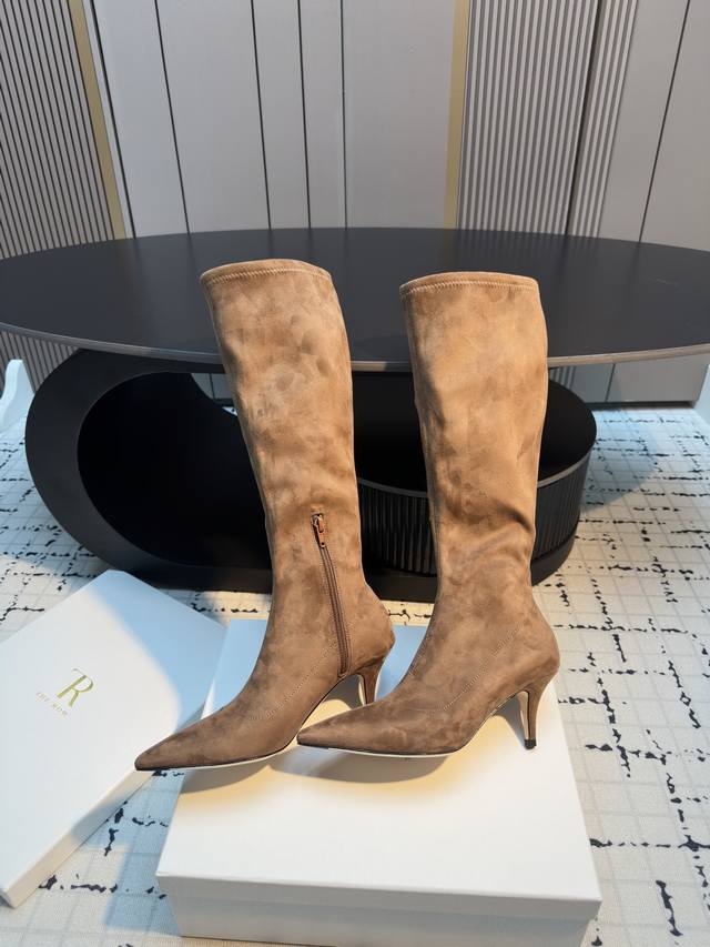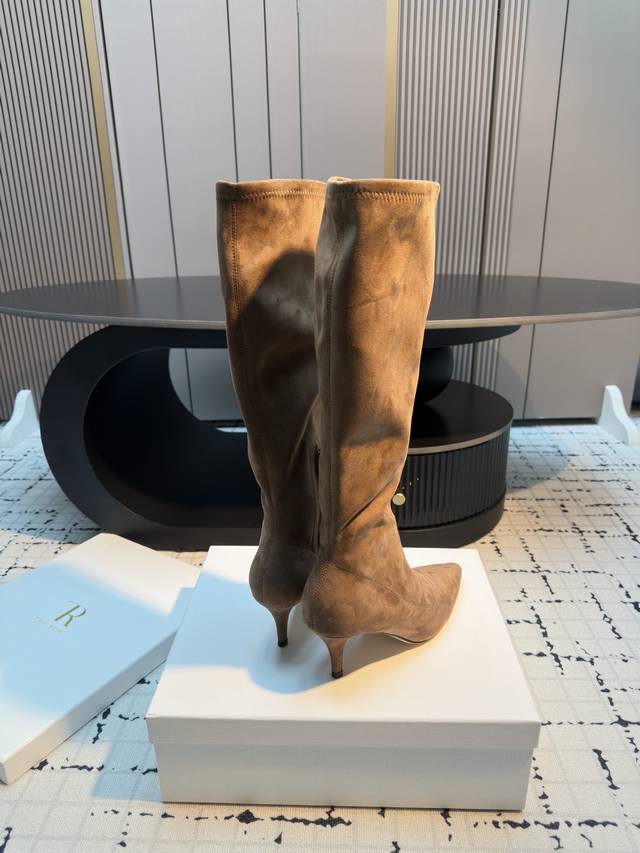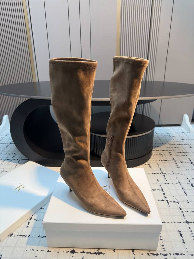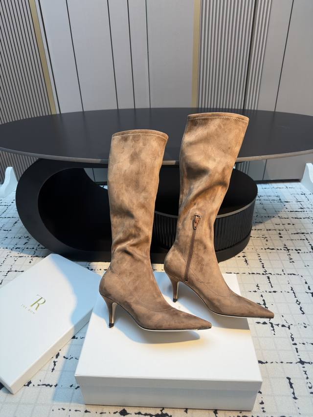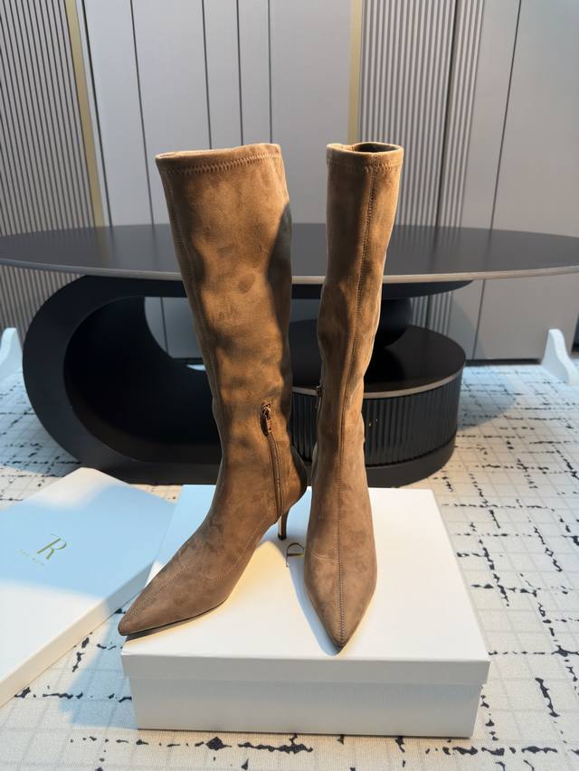 are made of a suede-like material with a delicate texture. The boots are a slim-fitting short-tube design with a zipper on the side for easy wearing and taking off, and they fit the ankle line well. The pointed toe adds a sense of refinement; paired with a stiletto heel, it enhances the overall elegance and femininity.