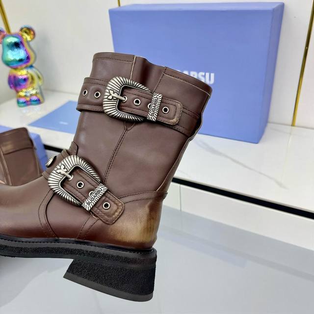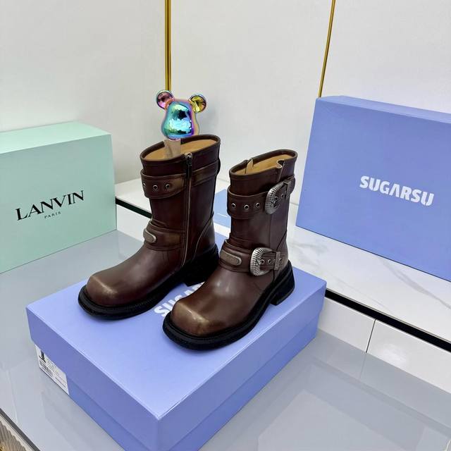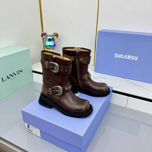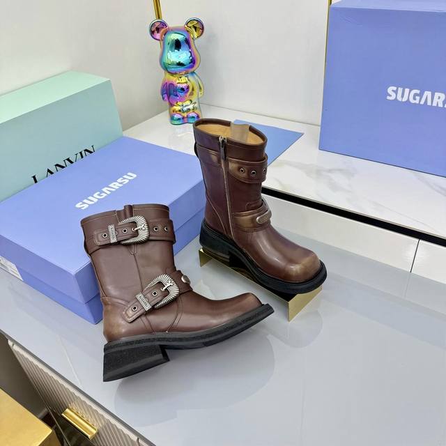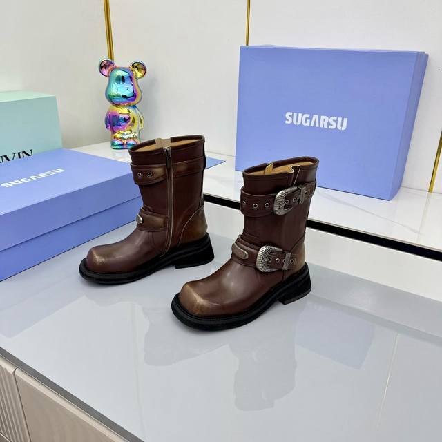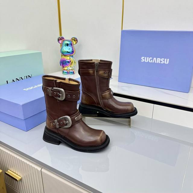 The tilted head design is adorable. Sugarsu 25Ss retro, youthful autumn and winter motorcycle boots. Buckles embellish the sides of the shoe for an extra eye-catching touch. The playful tilted head design combines with Sugarsu's wavy lines for a trendy and fashionable look. Autumn and winter ankle boots. Made with a molded rubber sole for a lightweight and stylish feel. Fabric: Waxed cowhide. Lining: Cowhide lining. Sizes: 35-40. Custom sizes available. Original packaging.