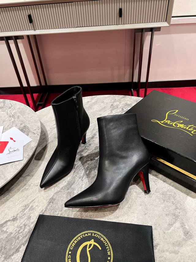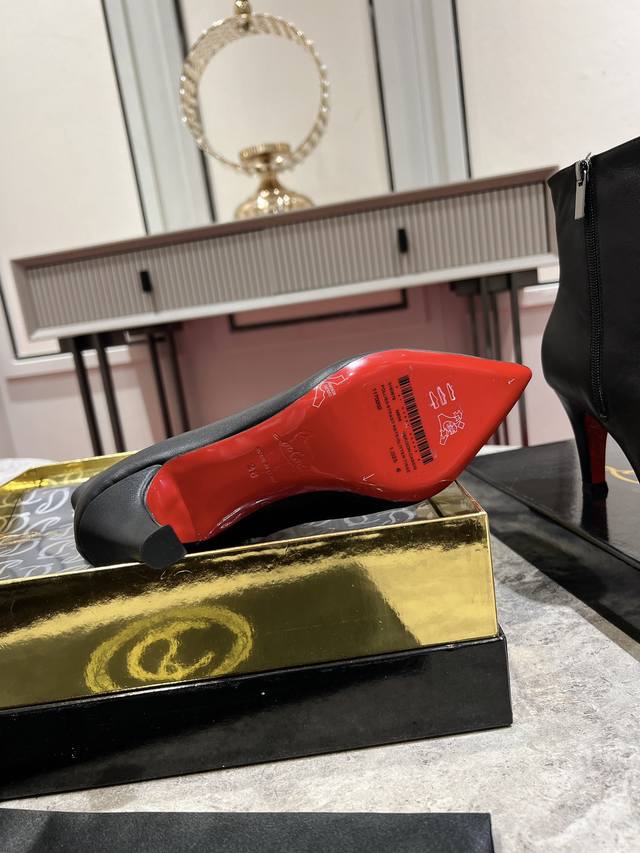 The Vibella Booty is a city boot made entirely of black calfskin. Featuring a pointed toe, its refined lines showcase Maison Christian Louboutin's "exquisite craftsmanship." This sophisticated style boasts an 85mm heel and subtle details. Material: Imported calfskin; Full sheepskin lining and insole; Italian genuine leather outsole. Sizes: 34-43 (34, 40, 41, 42, 43 are custom-made, no returns or exchanges; size 43 is 50). Color: Black/Brown. Heel Height: 8.5mm.