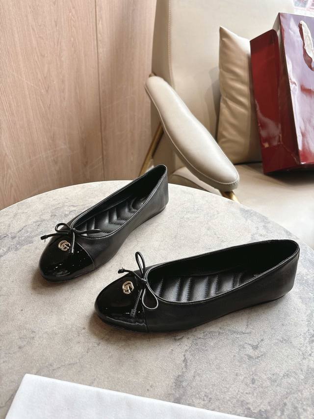 These ballet flats are crafted from smooth leather with patent leather toes, embodying a timeless elegance. A delicate bow accentuates femininity, while light gold Double G hardware subtly complements the brand's instantly recognizable logo.