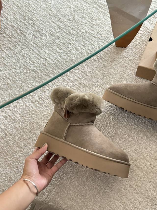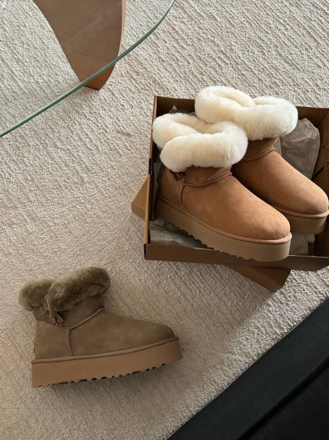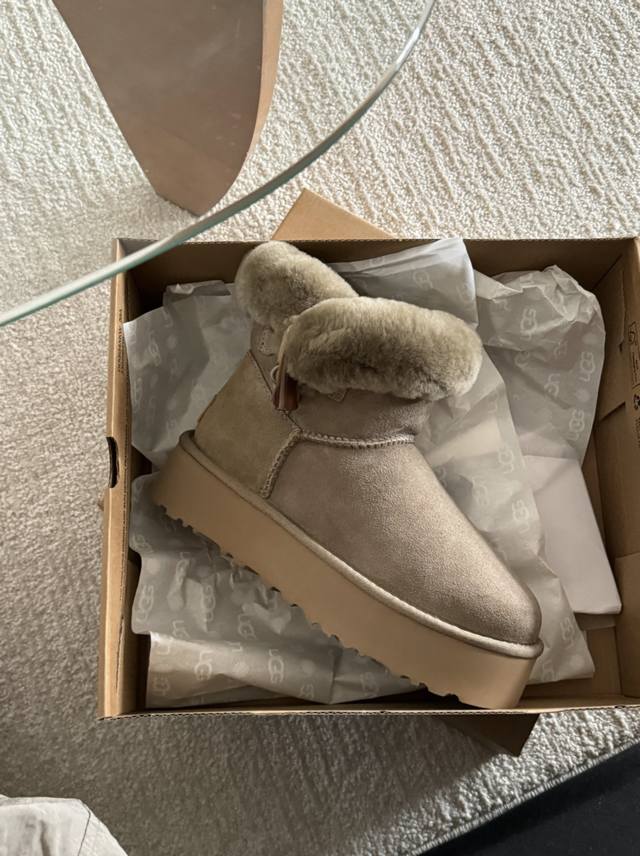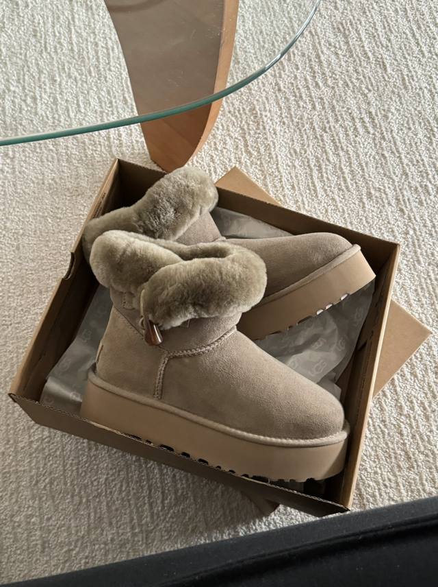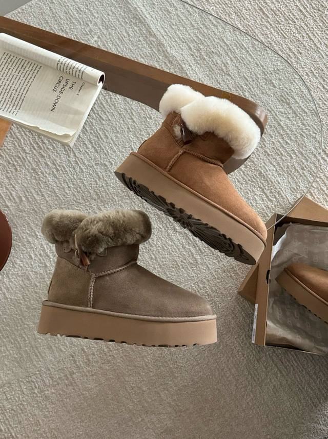 Thick-soled casual horn-buckle leather and fur ankle boots ~ Made with high-quality Grade A Longfeng leather and fur. Features a turned-up fur collar and horn buckle. Size: 35-40