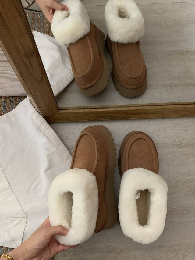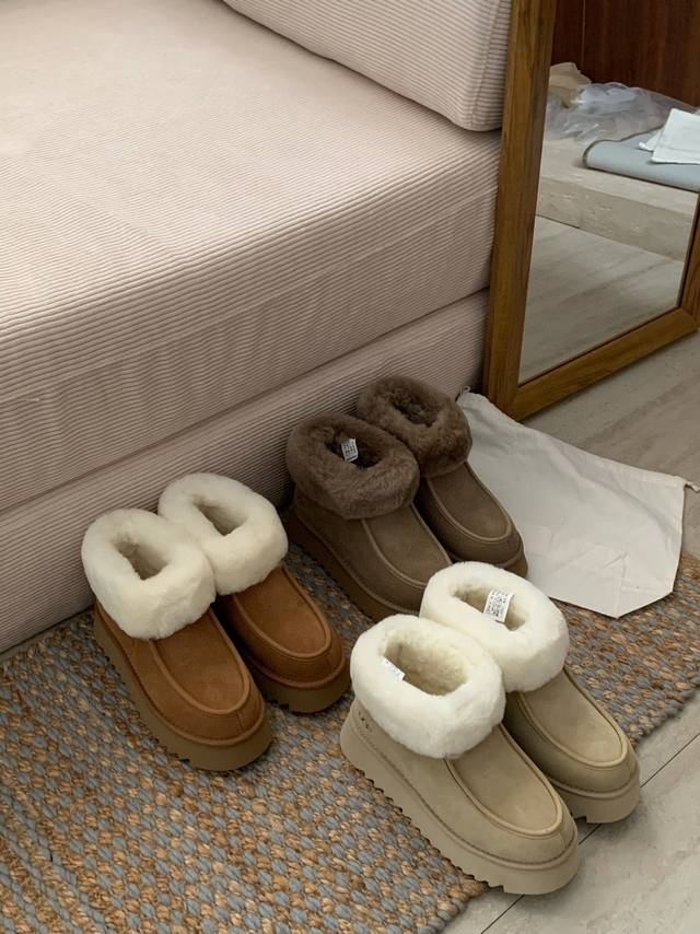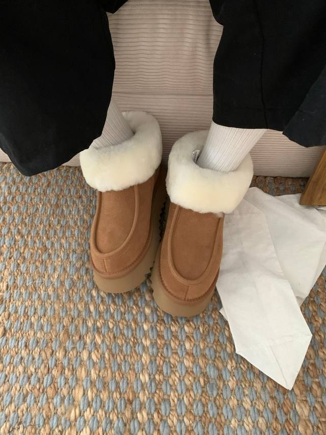 Thick-soled suede boots, three colors in stock. Super cute and warm with a fluffy opening, versatile and comfortable. Pairs well with knitted leg warmers for a stylish winter look. Also adds height and makes legs appear longer, preventing them from getting wet from snow. Sizes 35-40. Three colors: chestnut, mustard seed, antelope brown.