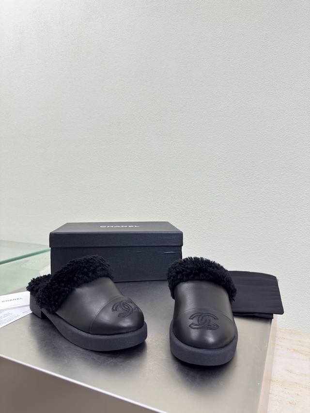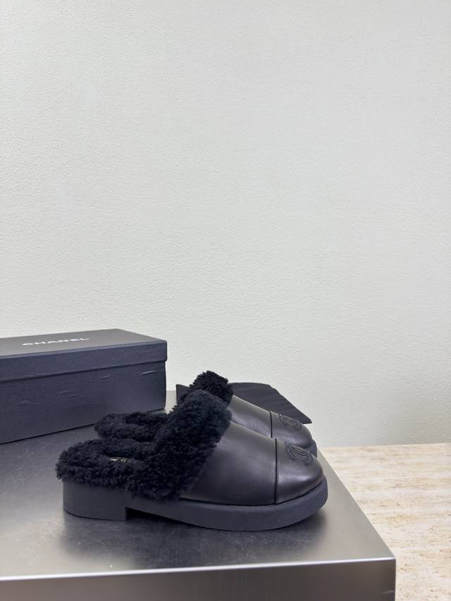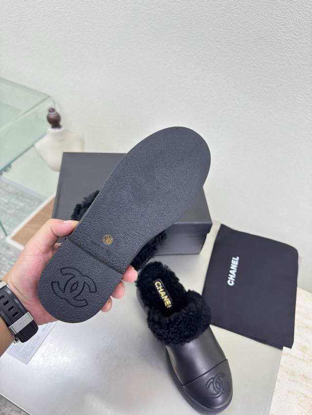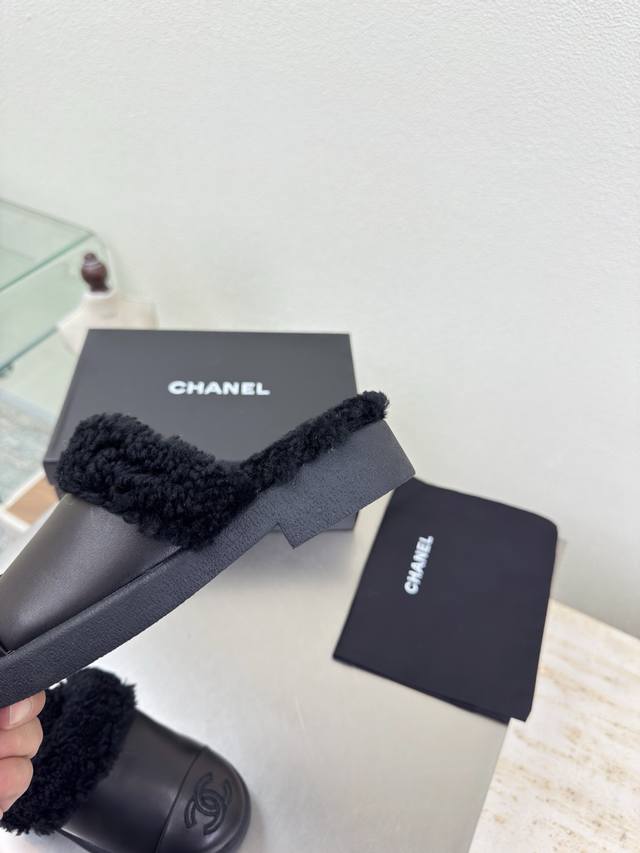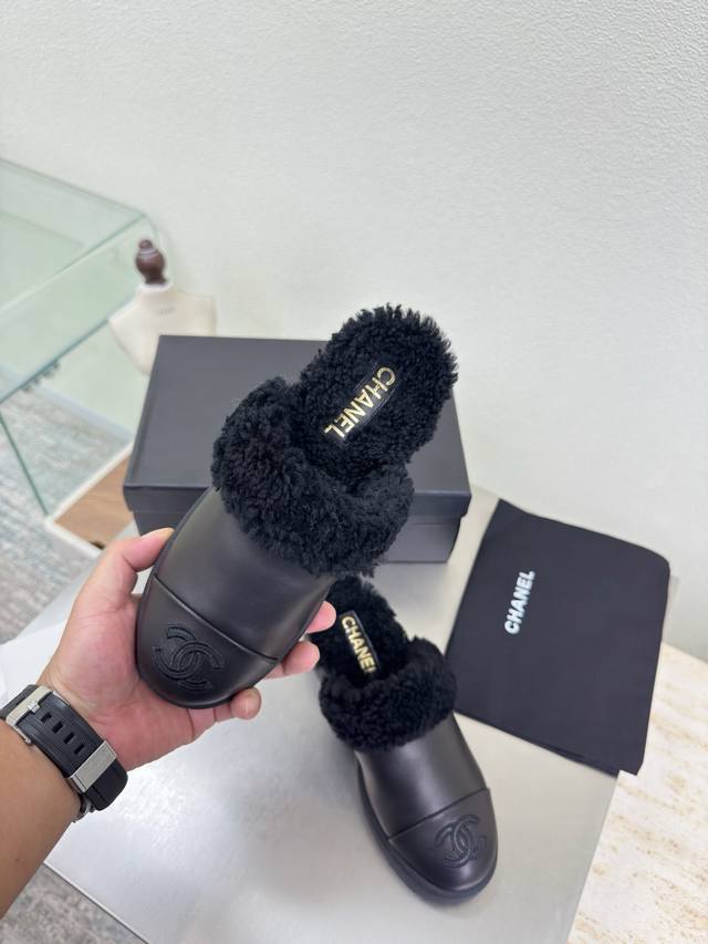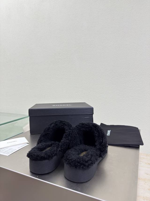 Thick-soled wool slippers, color-blocked material, wool-lined slippers, Chanel-style high quality at a great price, embroidered logo, comfortable and stylish, black lambskin, high-quality feel, creamy style, classic round toe and thick sole design for ultimate comfort, clearly visible and elegant logo, lambskin lining, clear logo on insole, comfortable, stamped brand logo, matching the original, quality guaranteed, outsole is the same as the original, thick sole for a premium feel, sizes 35 36 37 38 39 40 41, sizes 40 41 are custom-made, comes with original packaging, exquisite ribbon and camellia design.