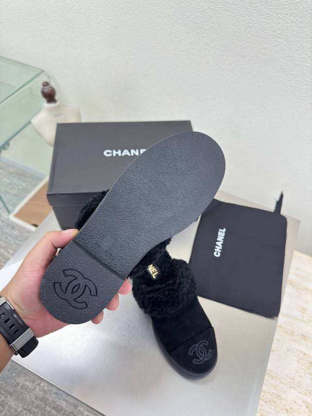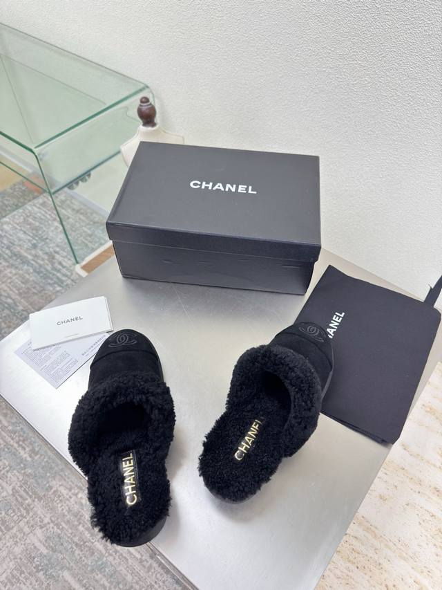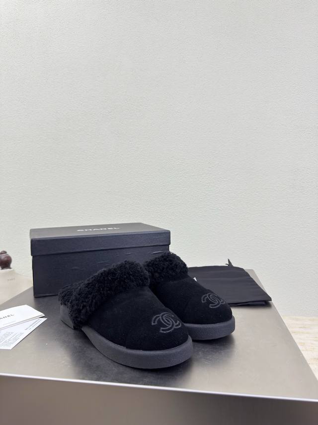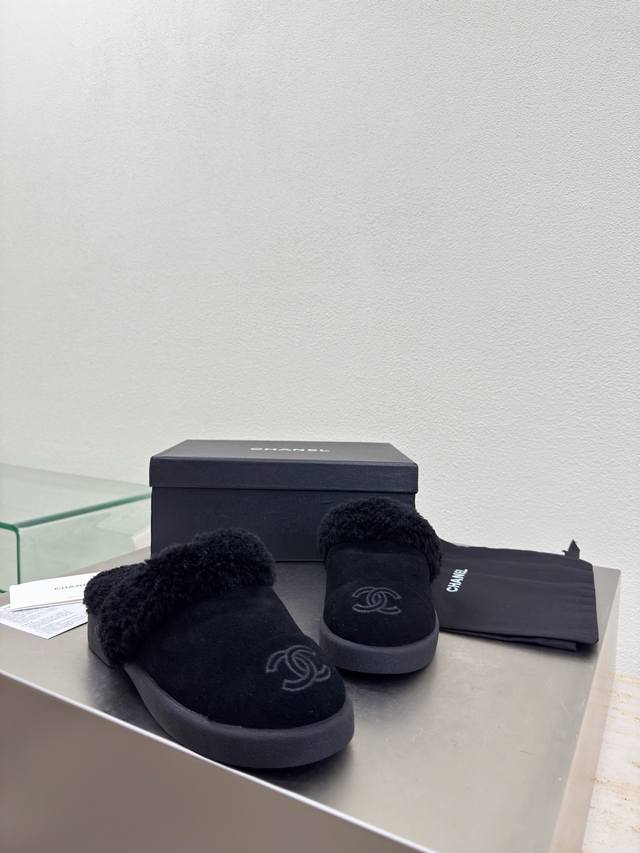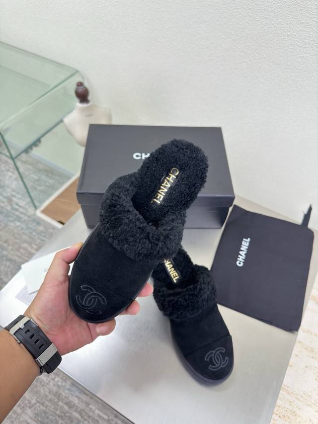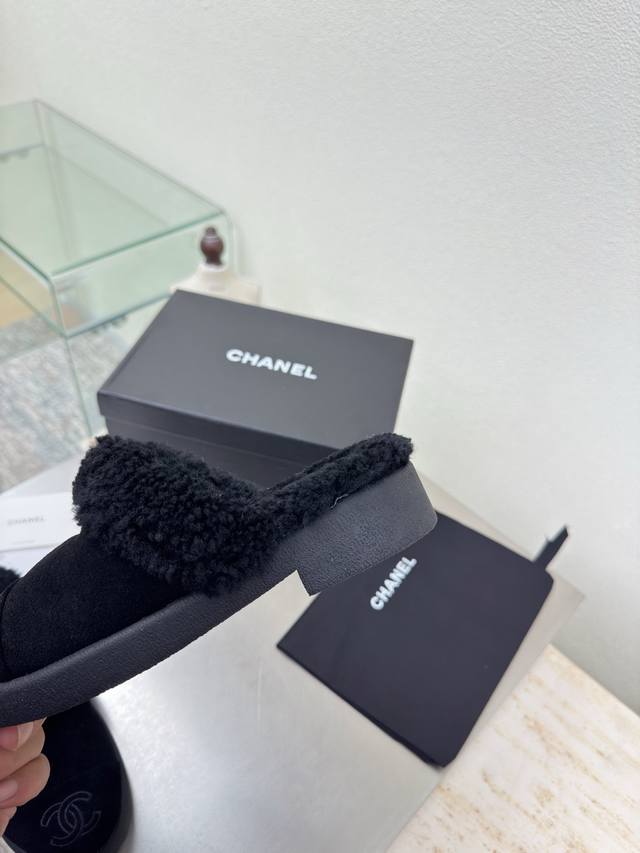 Thick-soled wool slippers, color-blocked material, wool-lined slippers, Chanel-style quality at a great price, embroidered logo, comfortable and stylish, black cow suede, full of texture, creamy style, classic round toe and thick sole design for ultimate comfort, clearly visible and elegant logo, lambskin lining, clear logo on insole, comfortable, stamped brand logo, matching the original, pursuing quality, outsole is the same as the original, thick sole for a premium feel, sizes 35 36 37 38 39 40 41, sizes 40 41 are custom-made, comes with original packaging, exquisite ribbon and camellia design.