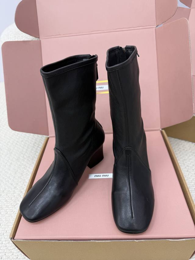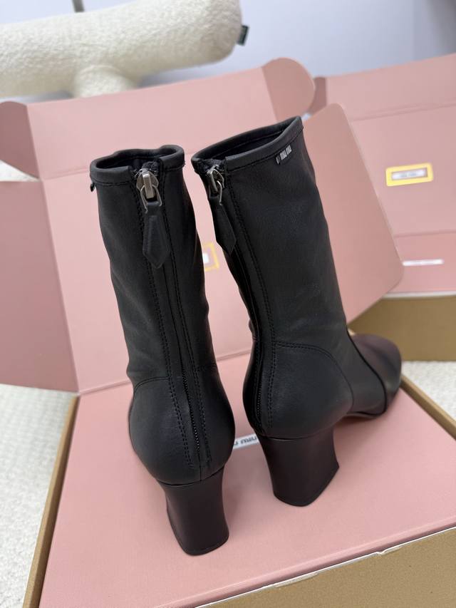 The boots feature a metal buckle embossed with the iconic logo, a theme also appearing on the armbands in the Spring/Summer 2025 collection. The 7.0mm square heel accentuates everyday femininity. Made of lambskin, with an elastic lambskin shaft and an Italian imported cowhide sole.