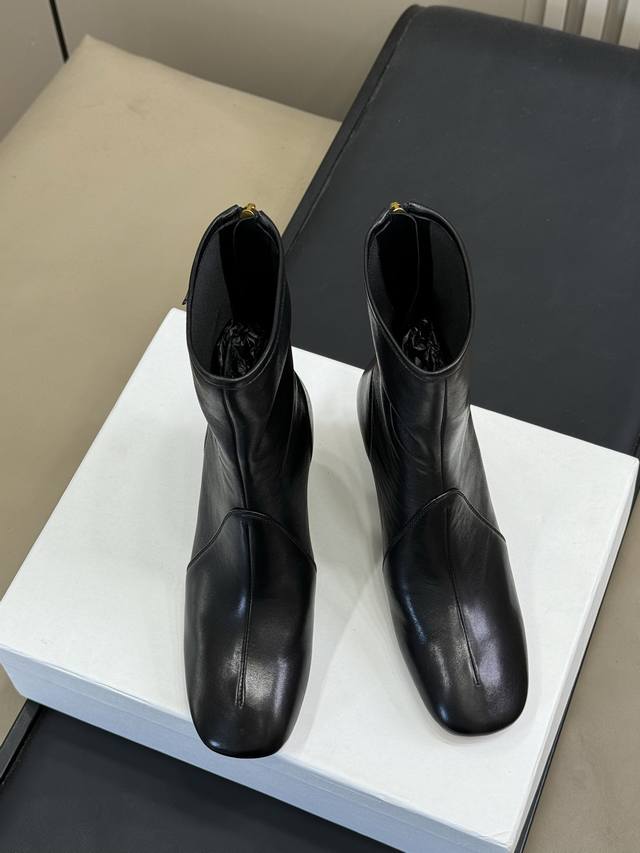 boots feature a metal buckle embossed with the iconic logo, a theme also appearing on the armbands in the Spring/Summer 2025 collection. The 65mm square heel accentuates everyday femininity. Made of lambskin, with a stretch lambskin shaft and an Italian imported cowhide sole. Sizes 35-41.