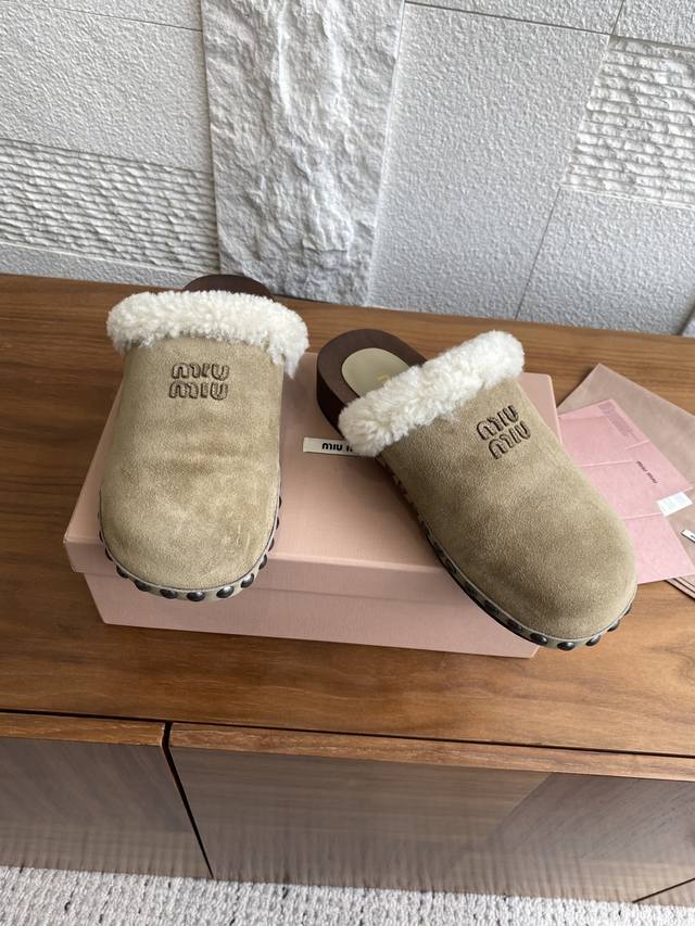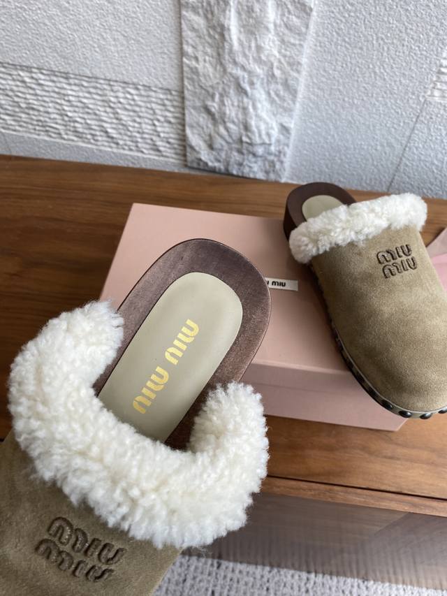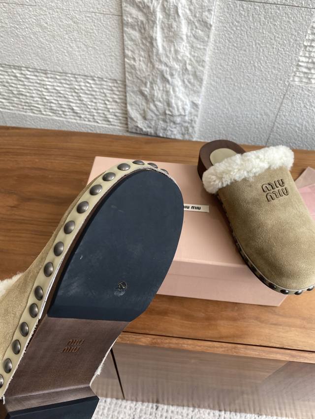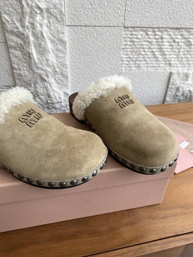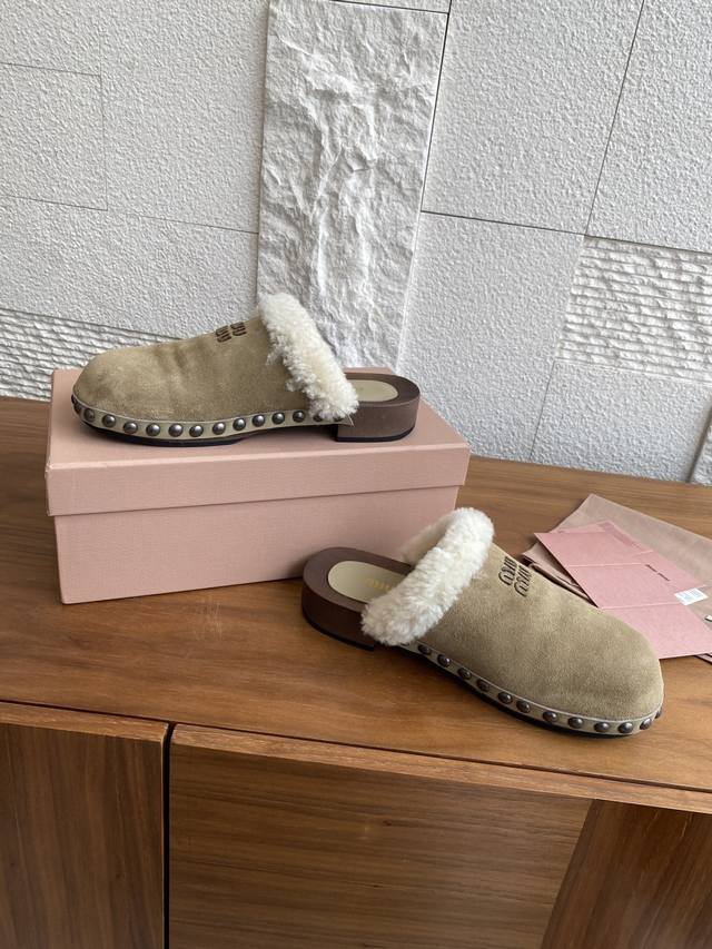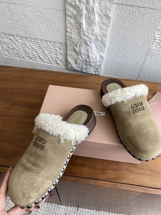 Miu Miu 25Ss Autumn/Winter New Suede Lambswool Lining Wooden Sole Open Heel Riveted Half-Slipper