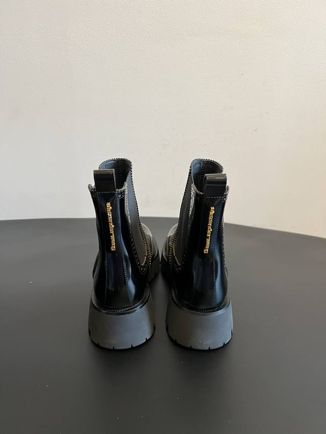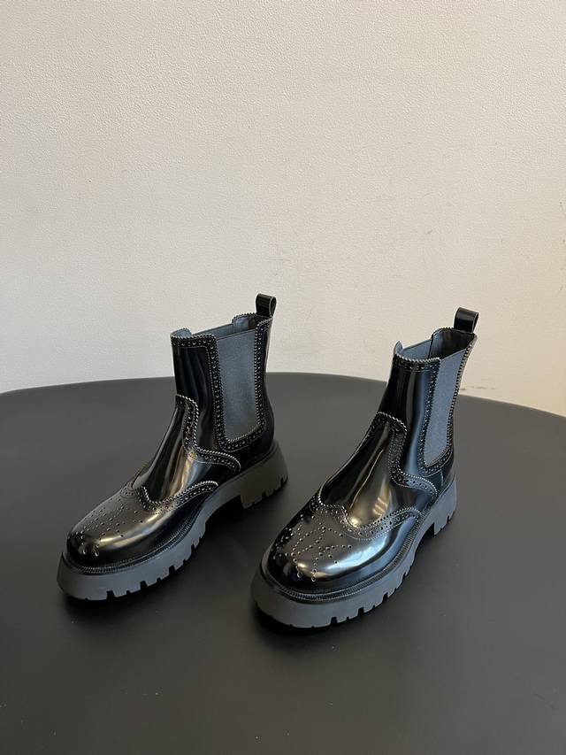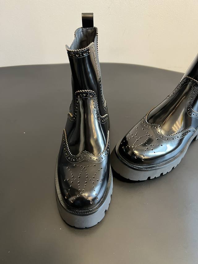 Top Quality Alexander Wang 25Ss Brogue Chelsea Boots. Combining traditional brogue detailing with the elasticated Chelsea boot shaft, these boots incorporate a chunky workwear-inspired design, retaining a retro elegance while injecting a street-style cool factor. Continuing Alexander Wang's signature "cool and minimalist" style, these boots add unique details to the classic silhouette, showcasing the brand's distinctive trendsetting attitude. The upper is made of glossy leather, offering a high-gloss finish that enhances visual sophistication and is easy to clean. The thick rubber outsole not only improves slip resistance but also effectively adds height, lengthens the legs, and optimizes body proportions. Material: Open-label cowhide; Lining: Sheepskin; Outsole: Original molded outsole; Height Increase: 5.5cm; Size: 35-40 (size 40 is custom-made and non-refundable).