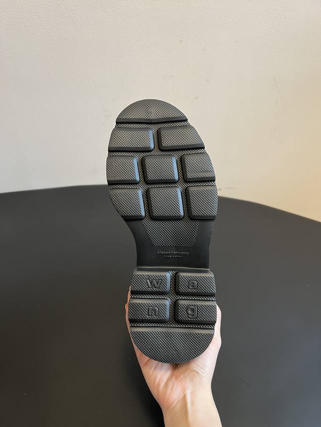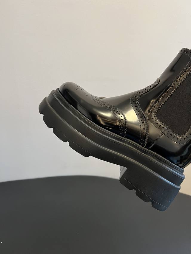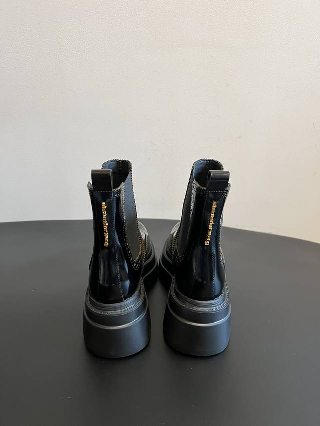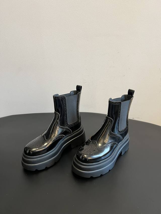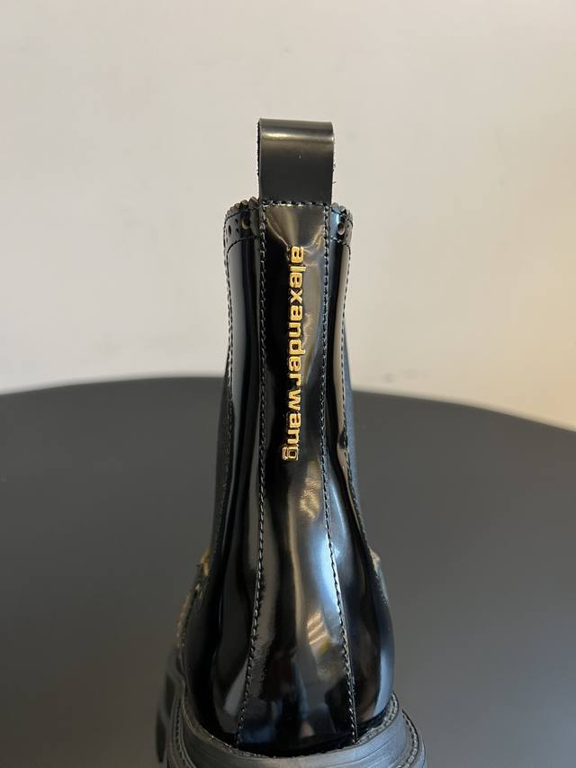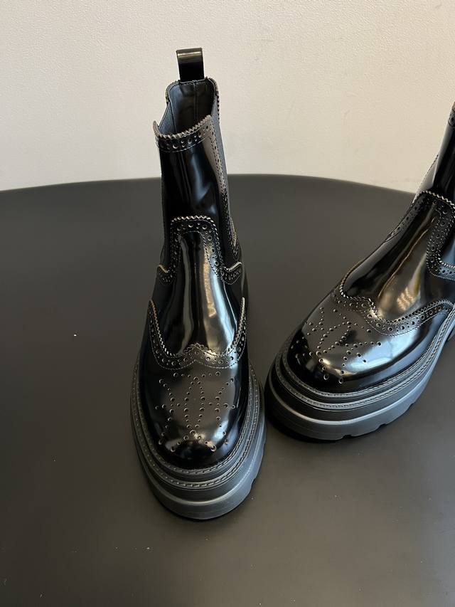 Top Quality Alexander Wang 25Ss Brogue Chelsea Boots. Combining traditional brogue detailing with the elasticated Chelsea boot shaft, these boots incorporate a chunky workwear-inspired design, retaining a retro elegance while injecting a street-style cool factor. Continuing Alexander Wang's signature "cool and minimalist" style, these boots add unique details to the classic silhouette, showcasing the brand's distinctive trendsetting attitude. The upper is made of glossy leather, offering a high-gloss finish that enhances visual sophistication and is easy to clean. The thick rubber outsole not only improves slip resistance but also effectively adds height, lengthens the legs, and optimizes body proportions. Material: Open-label cowhide; Lining: Sheepskin; Outsole: Original molded outsole; Height Increase: 5.5cm; Size: 35-40 (size 40 is custom-made and non-refundable).