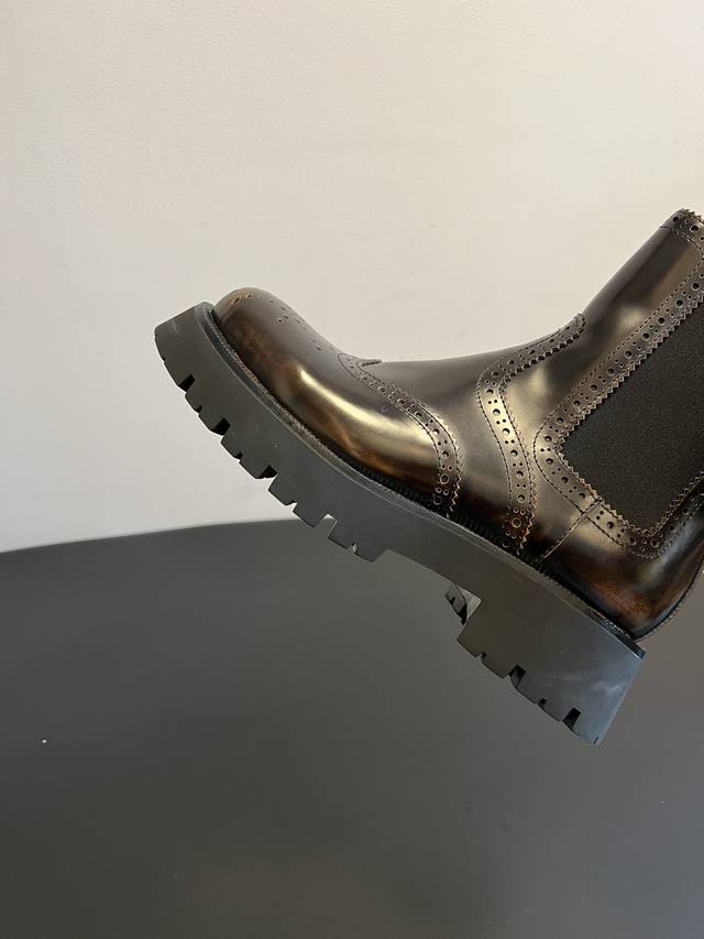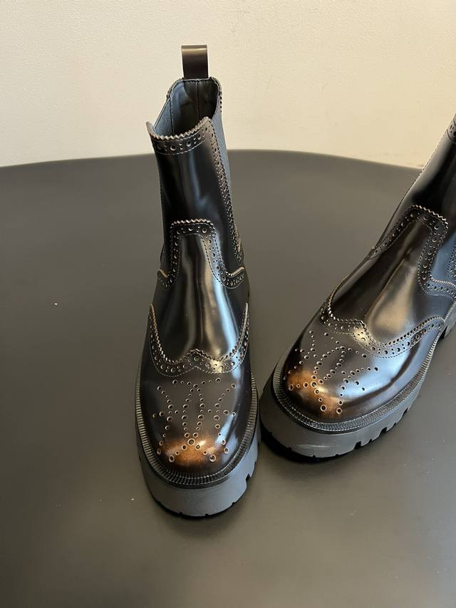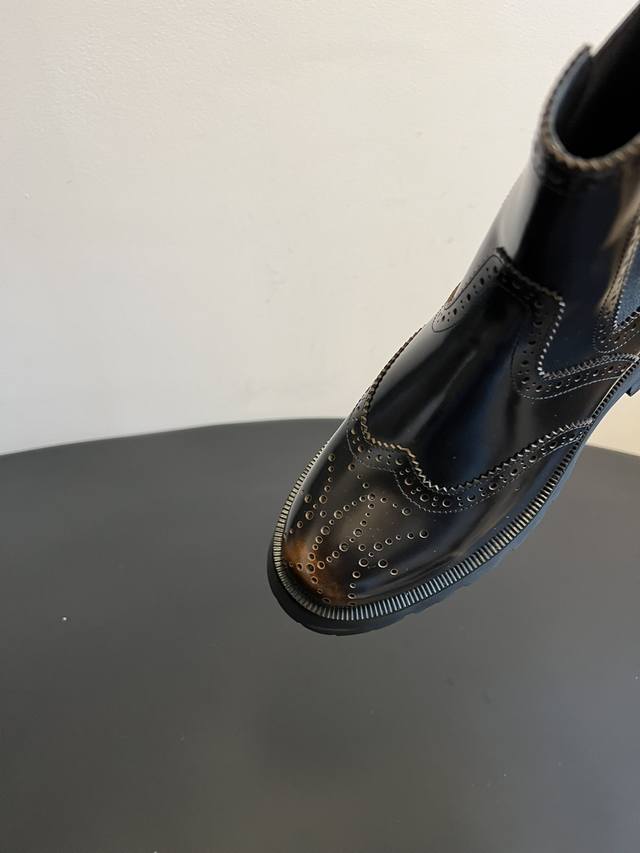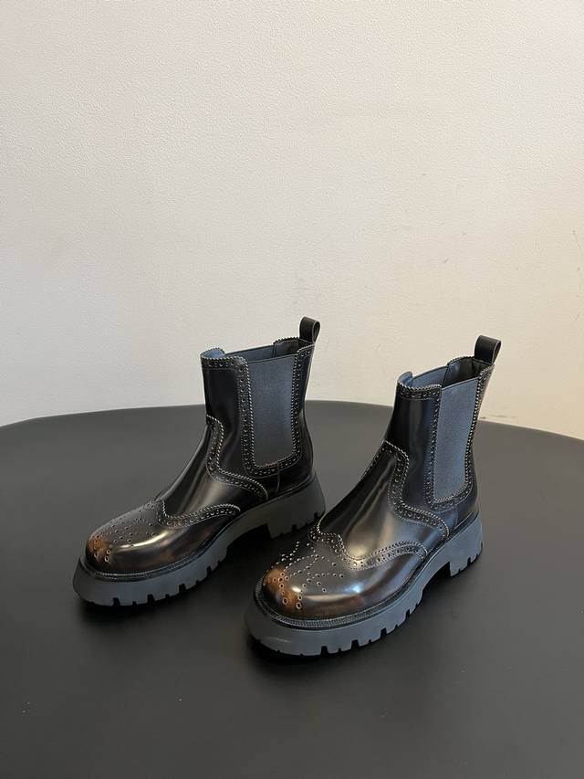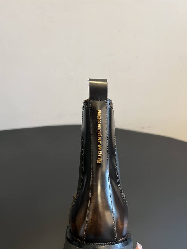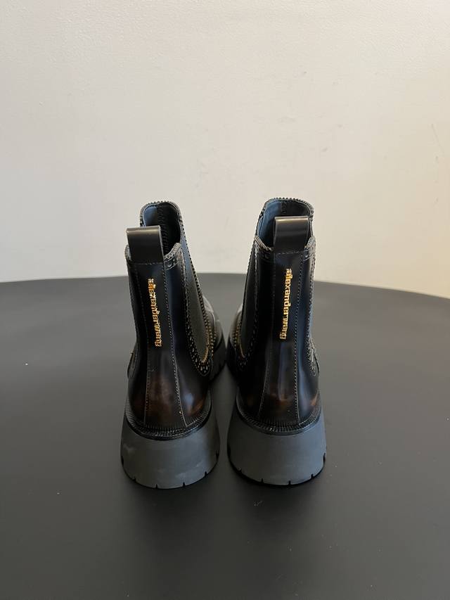 Top Quality Alexander Wang 25Ss Brogue Chelsea Boots. Combining traditional brogue detailing with the elasticated Chelsea boot shaft, these boots incorporate a chunky workwear-inspired design, retaining a retro elegance while injecting a street-style cool factor. Continuing Alexander Wang's signature "cool and minimalist" style, these boots add unique details to the classic silhouette, showcasing the brand's distinctive trendsetting attitude. The upper is made of glossy leather, offering a high-gloss finish that enhances visual sophistication and is easy to clean. The thick rubber outsole not only improves slip resistance but also effectively adds height, lengthens the legs, and optimizes body proportions. Material: Open-label cowhide; Lining: Sheepskin; Outsole: Original molded outsole; Height Increase: 5.5cm; Size: 35-40 (size 40 is custom-made and non-refundable).