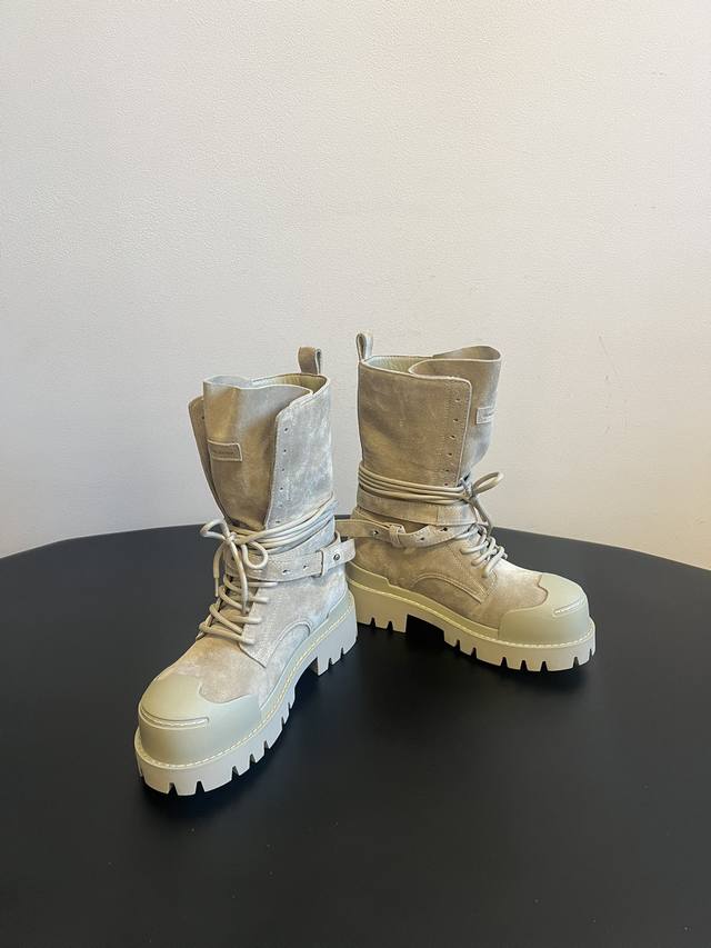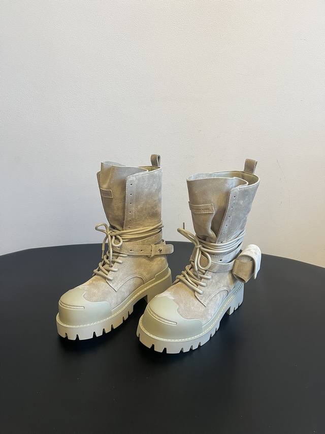 Top Quality DDD Dymonlatr* Autumn/Winter New Functional Style Open-Mouth Boots DDD The black boots are made of glossy leather with a lace-up design on the upper and functional buckle components on the side. The thick, serrated outsole enhances grip and style. The off-white boots are made of suede-like material, also featuring laces and side buckles. The toe and heel have anti-collision material panels, and the thick sole provides added height. DDD The overall design blends workwear, functionality, and futuristic elements, with details such as buckles and thick soles emphasizing both " outdoor functionality" and "trendsetting style." DDD Upper: Cowhide Suede DDD Lining: Cowhide DDD Outsole: Original Mold Outsole DDD Height Increase: 7cm DDD Size: 35-40, Size 40 is custom-made and non-refundable DDD