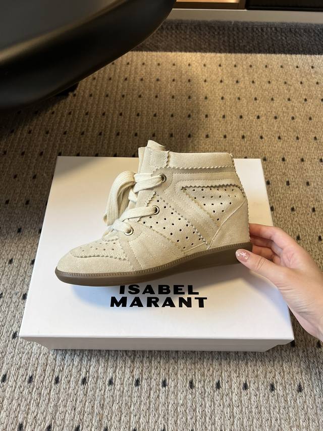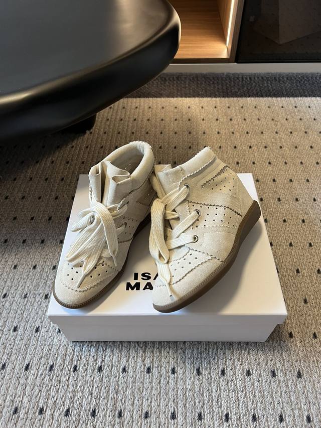Made of suede material, it has a delicate texture and a retro charm; the upper has a hollow and wavy stitching design, with exquisite details and a layered feel. The high-top style can modify the ankle line, and the inner heightened design can visually lengthen the leg proportions while ensuring wearing comfort, combining beauty and practicality.