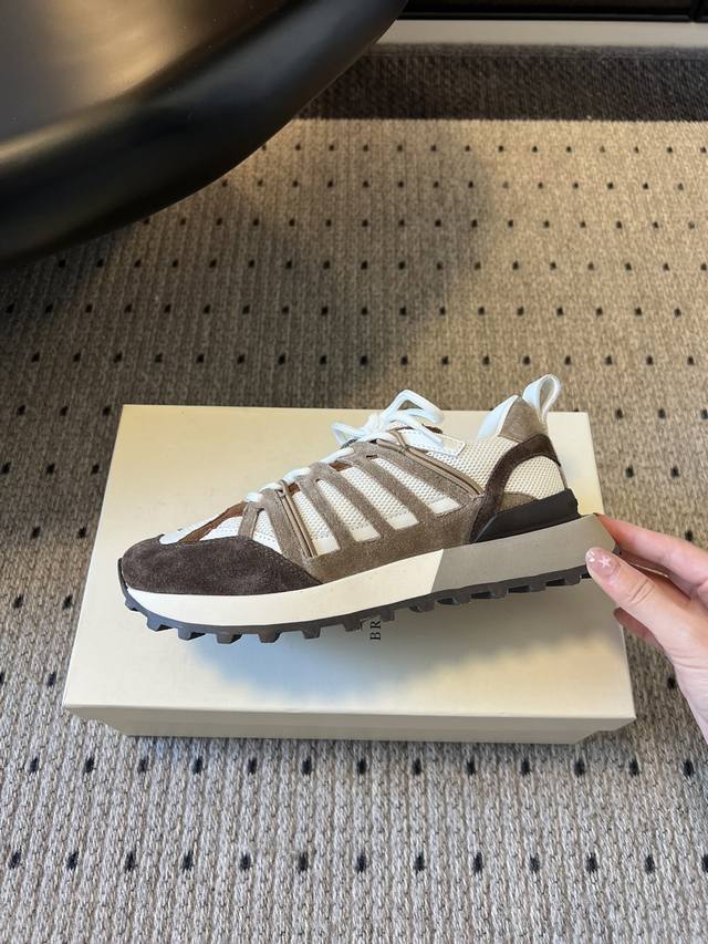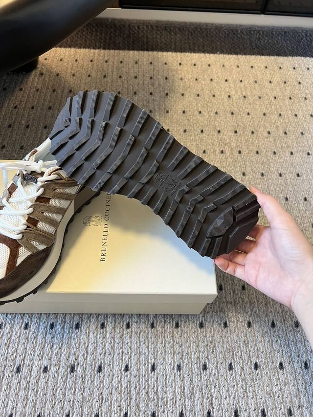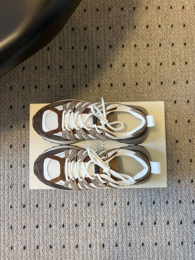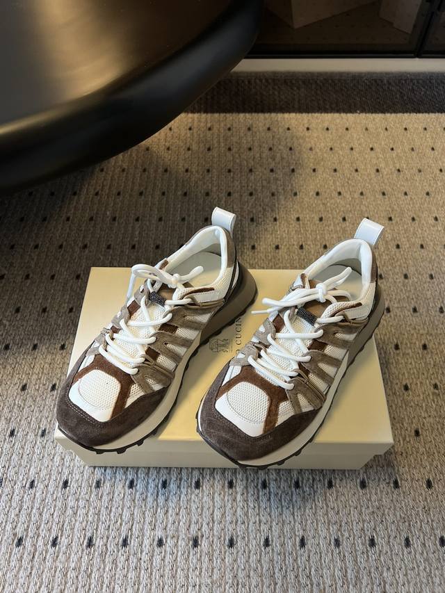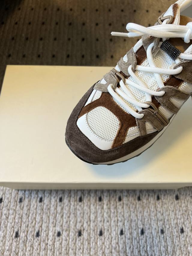 Brunello Cucinel* Ss25 Beaded Details Sneakers. These sneakers blend retro and modern design elements, featuring a multi-material upper with mesh, leather, and suede for a layered and textured look. The unique lacing system adds to the shoe's distinctiveness. Made with high-quality leather and suede, the shoes are meticulously crafted, reflecting the brand's luxurious feel and exquisite craftsmanship. The platform sole not only provides height but also cushioning, making them suitable for everyday wear, combining style and comfort. Upper: Mesh Suede Lining: Sheepskin Outsole: Original Mold Outsole Size: 35-45