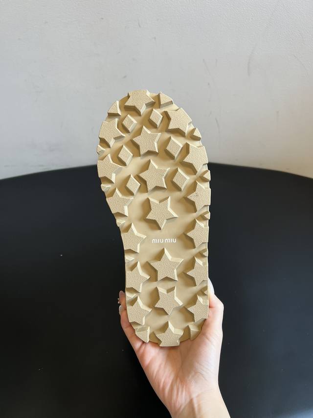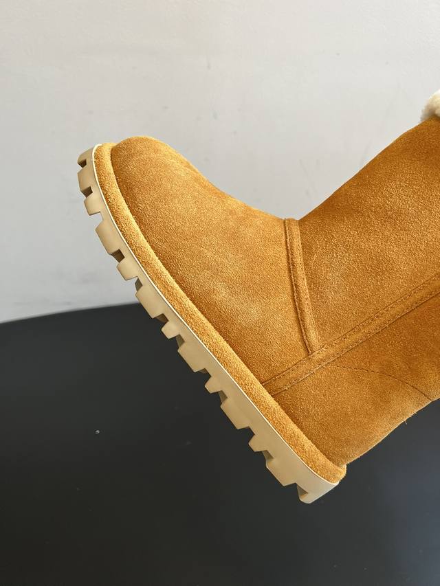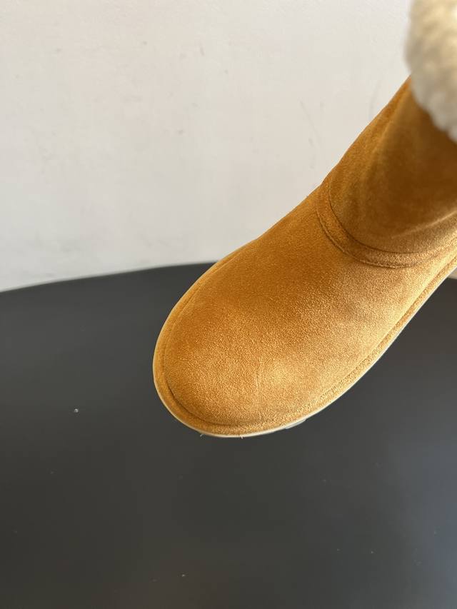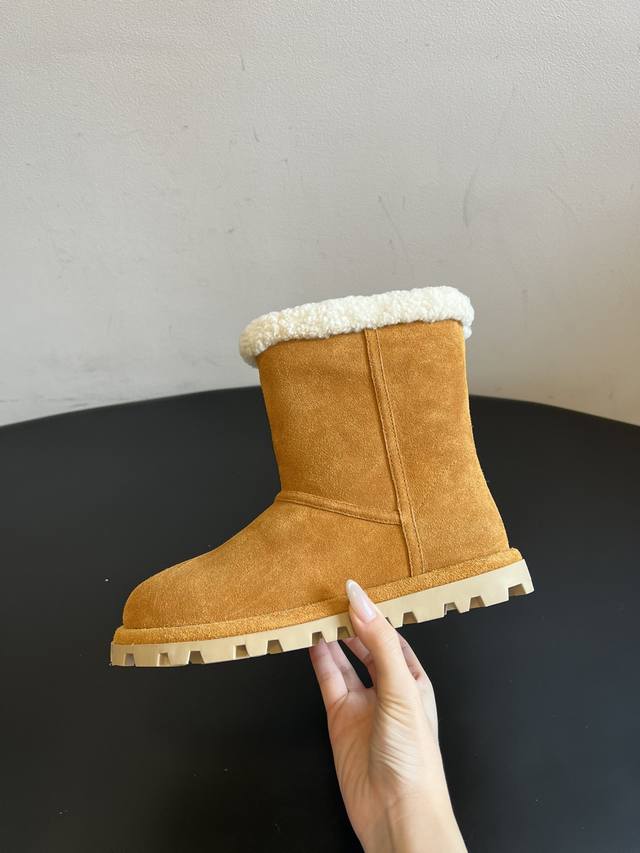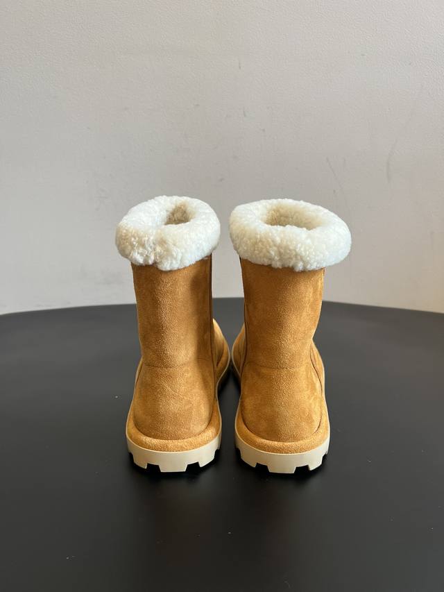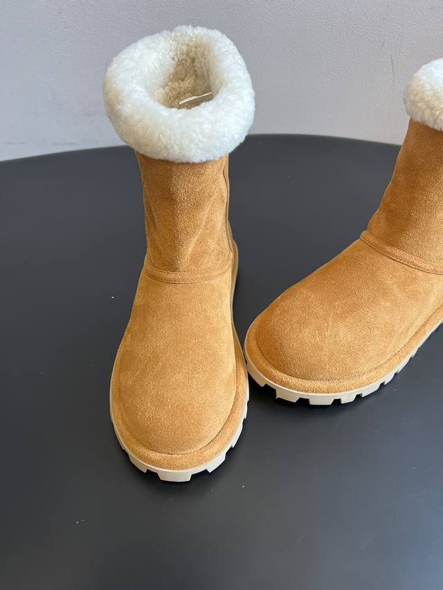 Top Quality Miu Mi* 25Ss Autumn/Winter New Fleece-Lined Short Snow Boots. The upper is made of suede, with thick fleece lining at the top and inside, providing extra warmth for autumn and winter, perfect for cold weather. The serrated sole offers good slip resistance, providing stability while also slightly increasing height. The short boot design and soft colors make them versatile enough to pair with both casual and feminine outfits, a perfect "lazy girl" style for autumn and winter. The loose fit prevents the boots from feeling cramped, and the boot height sits perfectly at the ankle without looking bulky. Upper: Cow Suede; Lining: Wool; Outsole: Rubber; Height Increase: 2.5cm; Size: 35-40 (Size 40 is custom-made and non-refundable) .