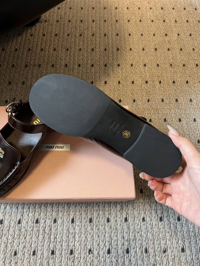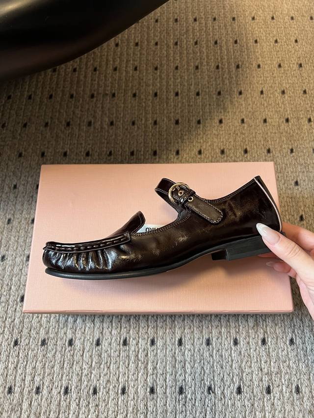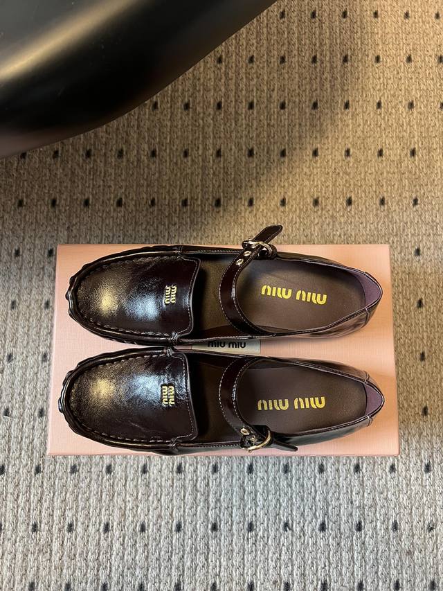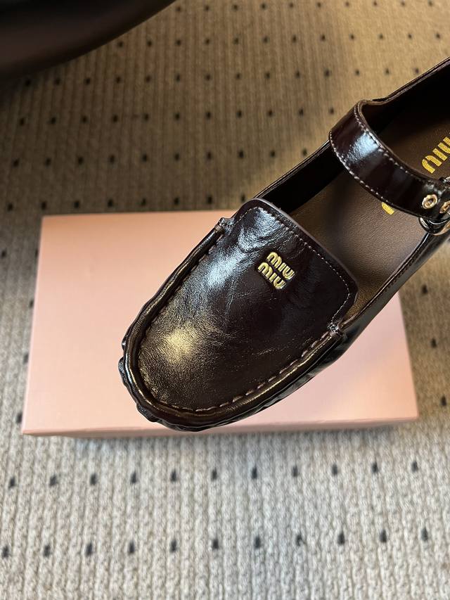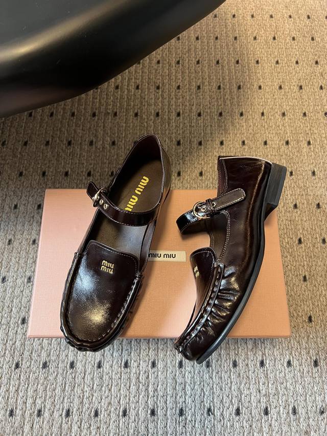 Top Quality Miu Mi* Retro Preppy Mary Jane Loafers. Combining the buckle design of Mary Janes with the relaxed feel of loafers, these shoes exude a retro preppy style while maintaining a touch of understated luxury and cool chic. The upper is made of glossy leather with a sophisticated sheen; the Miu Miu logo is present on both the shoe body and lining, highlighting brand recognition in the details; the buckle has a metallic texture, creating a refined look against the leather. The flat design ensures comfort and prevents foot fatigue; the loose and forgiving fit accommodates most foot shapes; easy to slip on and off, suitable for daily commutes or casual wear. They can be paired with preppy uniforms, retro dresses, jeans, and complement various styles including sweet and cool, mature and casual. Upper: Top-grain oiled cowhide; Lining: Sheepskin; Outsole: Rubber; Height: 2cm; Size: 35-40 (size 40 is custom-made and non-refundable).