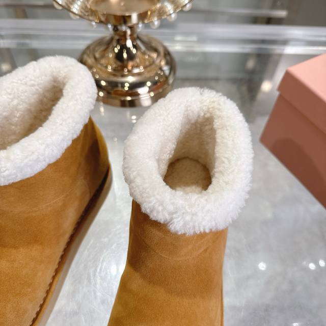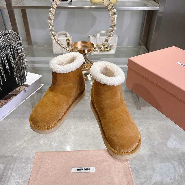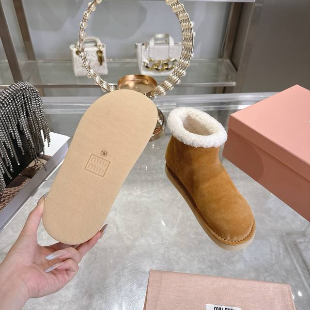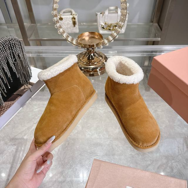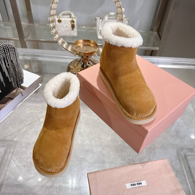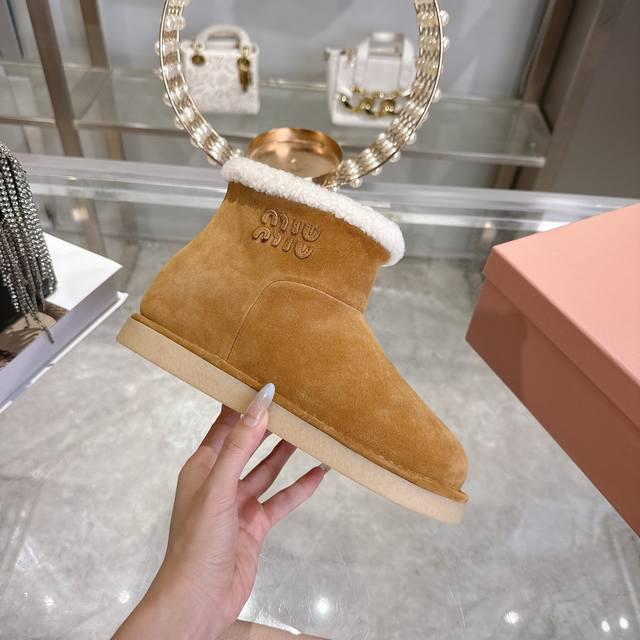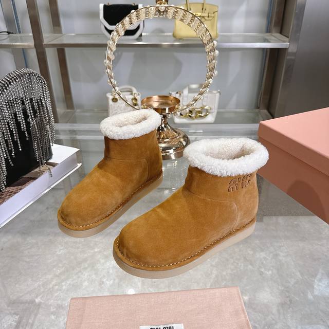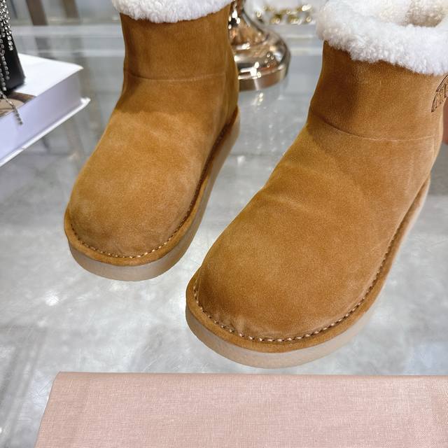 Top quality Miu Miu 2025 Winter New Style Simple Round Toe Lambswool Snow Boots! Most winter snow boots are very thick and heavy, but this Miu Miu style is so cute this winter! The simple round toe design, with a logo embellishment on the side, is adorable yet warm for winter. The upper is made of imported cow suede, the insole is made of Australian curly wool, and the outsole uses original Ev fumed rubber for slip resistance! Sizes: 35-40. Size 40 is custom-made and non-refundable. Comes with original packaging.