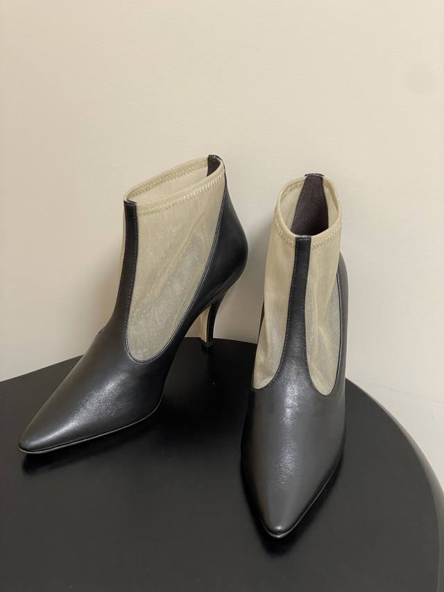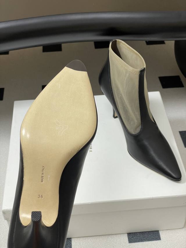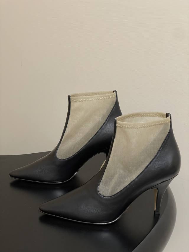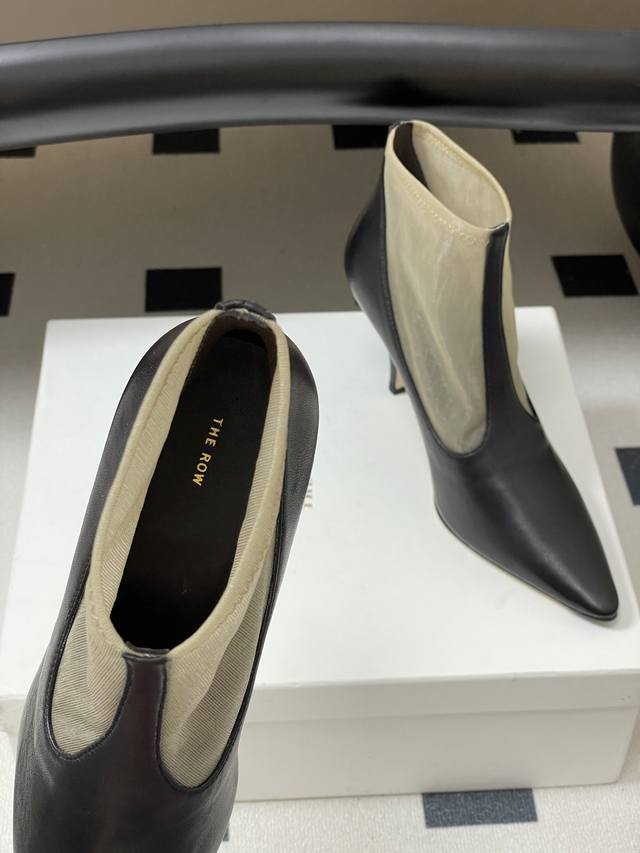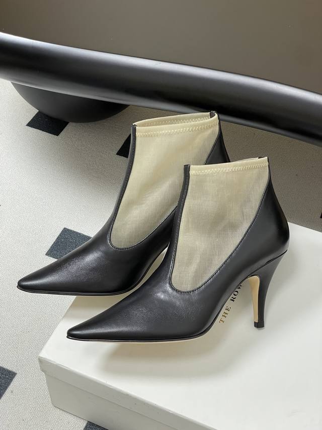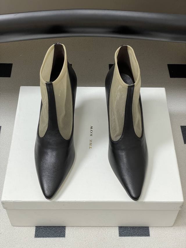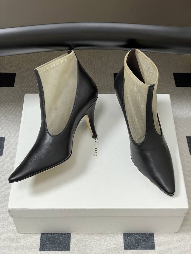 The Row 25S Early Fall New Tr Hot Mesh Boots Minimalist Style Small Pointed Toe Mesh Boots Kitten Heel Mesh Ankle Boots High Heeled Sandals