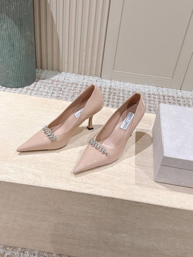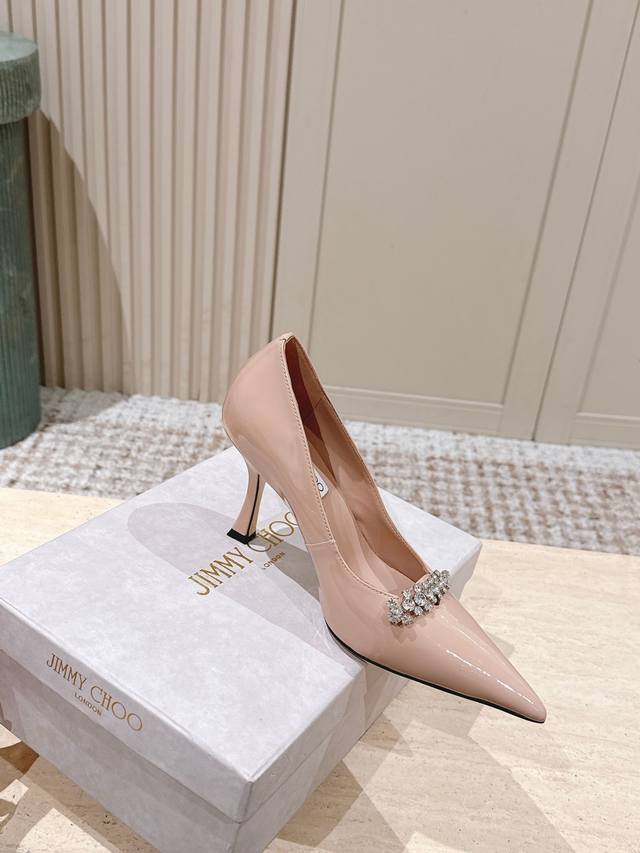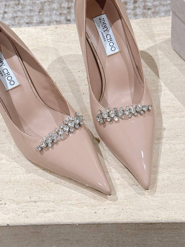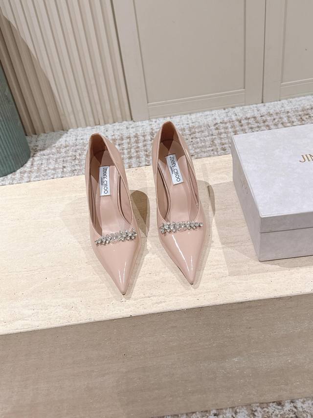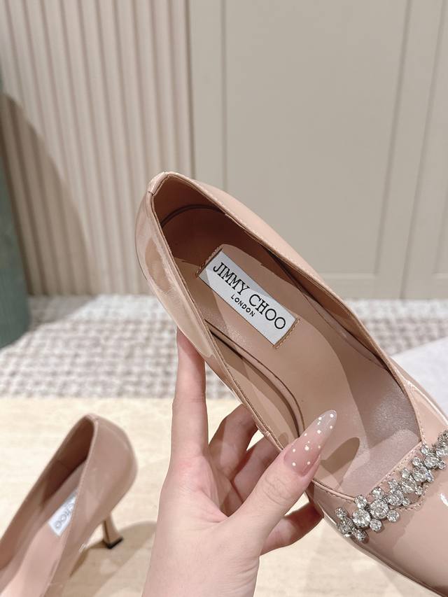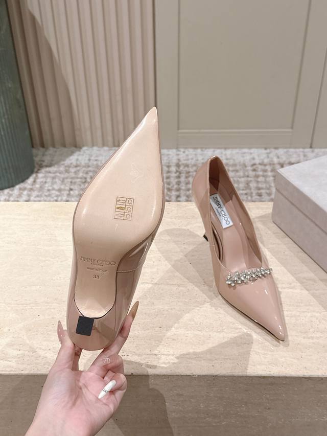 Top Version: 390 DDD Jimmy Choo 25Ss Autumn New Arrival Pointed Toe Belinda Pum High Heels DDD Jimmy Choo's Belinda Pum series high heels are crafted from high-gloss patent leather, creating a modern silhouette. The distinctive pointed toe design paired with a 9cm heel and exquisite crystal-embellished straps shimmer, making the feet incredibly charming. DDD Material: Imported calfskin patent leather DDD Lining: Imported sheepskin DDD Outsole: Italian imported genuine leather DDD Heel height: 9cm DDD Size: 35-41 40 41 Custom orders are non-refundable DDD